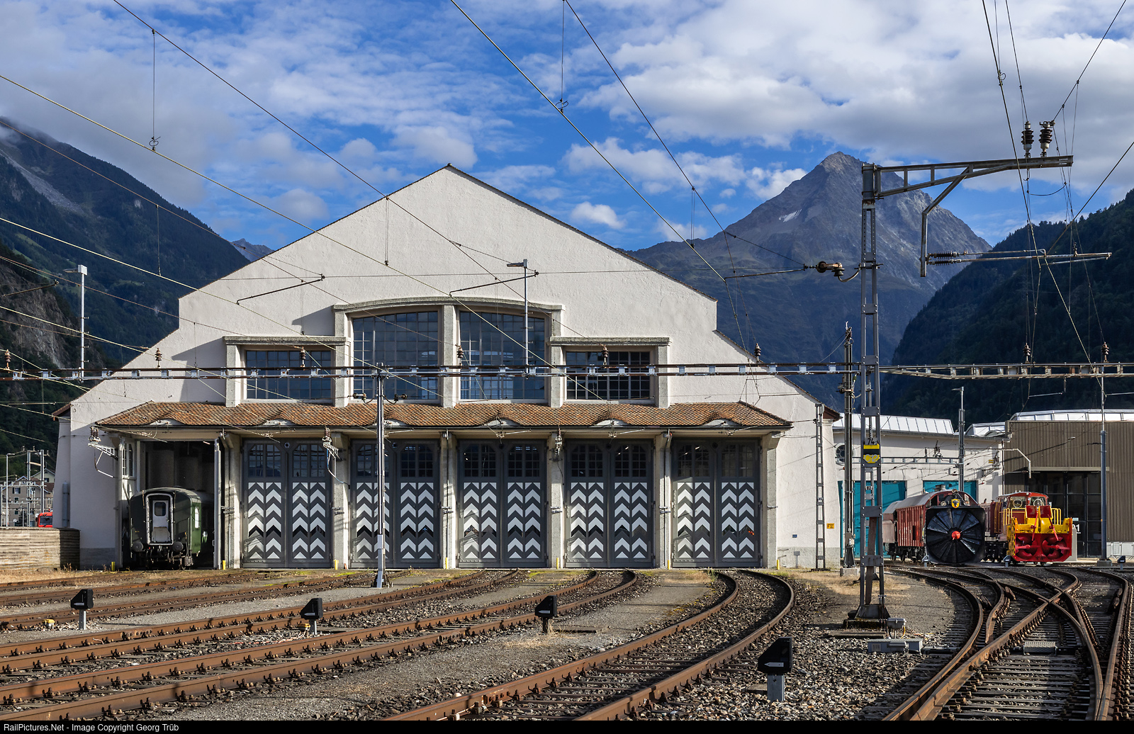 It is Sunday evening at 5:45 p.m. and the Gotthard Railway Days 2025 have come to an end. On the right are the two snowblowers, the steam snowblower Xrot # 100 from 1896, built for the Gotthard Railway, and on the far right the diesel snowblower Xrotm # 96 from 1982. The buildings of the Erstfeld depot, including the transfer table and steam shed from 1883, were extensively renovated by SBB Real Estate in 2023. The gates at the large shed from 1921 were rebuilt in wood, true to the original. The last special train from Göschenen to Erstfeld has not yet returned from the route. Due to a defect in the Ce 6/8 II # 14253, the train had to be towed by the Ae 8/14 # 11801. In the background is 3073 meter high Bristen mountain.