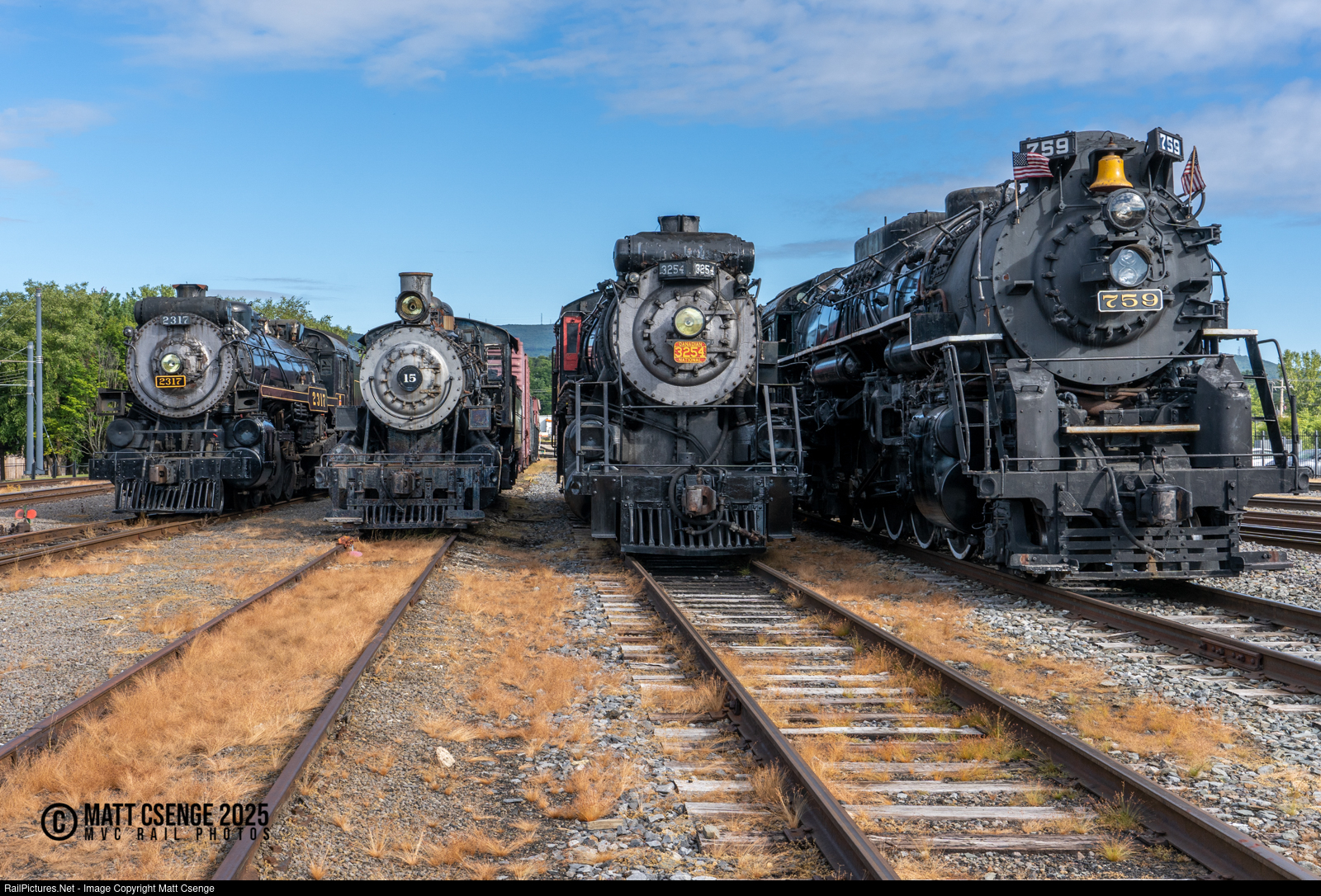 Steamtown Lineup. Four steam locomotives are on display at Steamtown during the Railfest 2025 event on Labor Day weekend. From left to right: Canadian Pacific (CP) 4-6-2 Pacific no. 2317; Rahway Valley (RV) 2-8-0 Consolidation no. 15; Canadian National (CN) 2-8-2 Mikado no. 3254; and Nickel Plate (NKP) 2-8-4 Berkshire no. 759.
