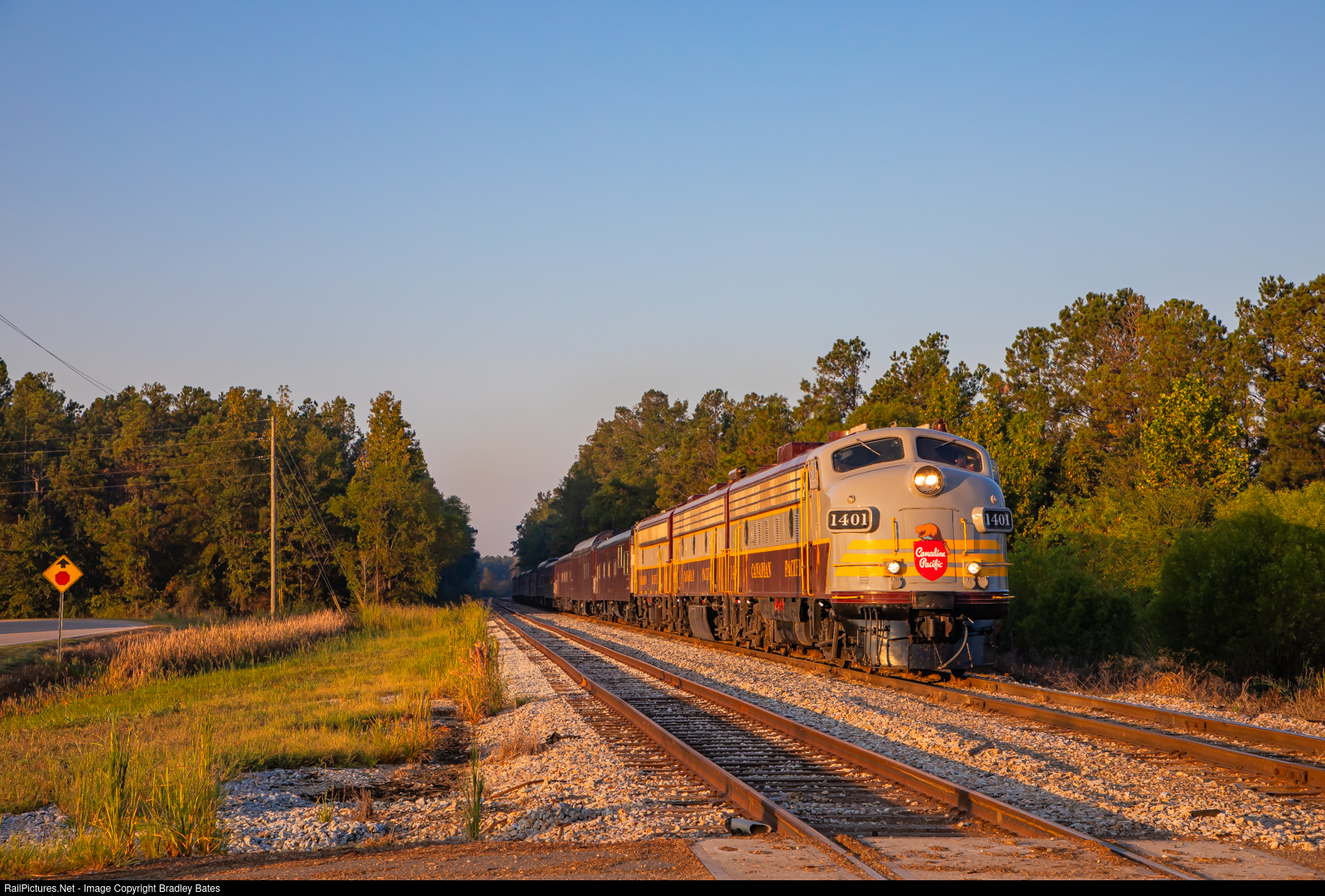 | CP F9 #1401 leads CPKC's deadhead move of the Office Car Special eastbound to Montgomery through Naheola, AL. running as train 42B.