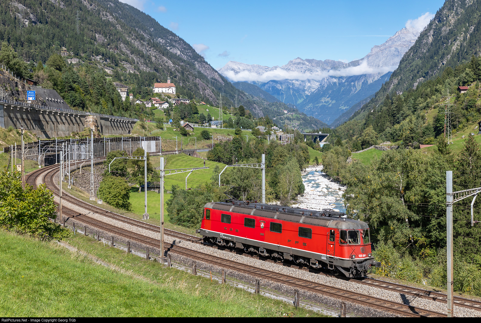 | 10600 Hp (7850 kW) Gotthard locomotive Re 620 # 066 (Re 6/6 # 11666) "Stein am Rhein" of SBB Historic, built in 1978 and based new in Erstfeld, is running light up the Gotthard north ramp between Gurtnellen and Wassen through the Wattinger curve. The locomotive will serve as electric brake power on the steam train with C 5/6 # 2978 from Göschenen down to Erstfeld on the 2.6 % grade. |