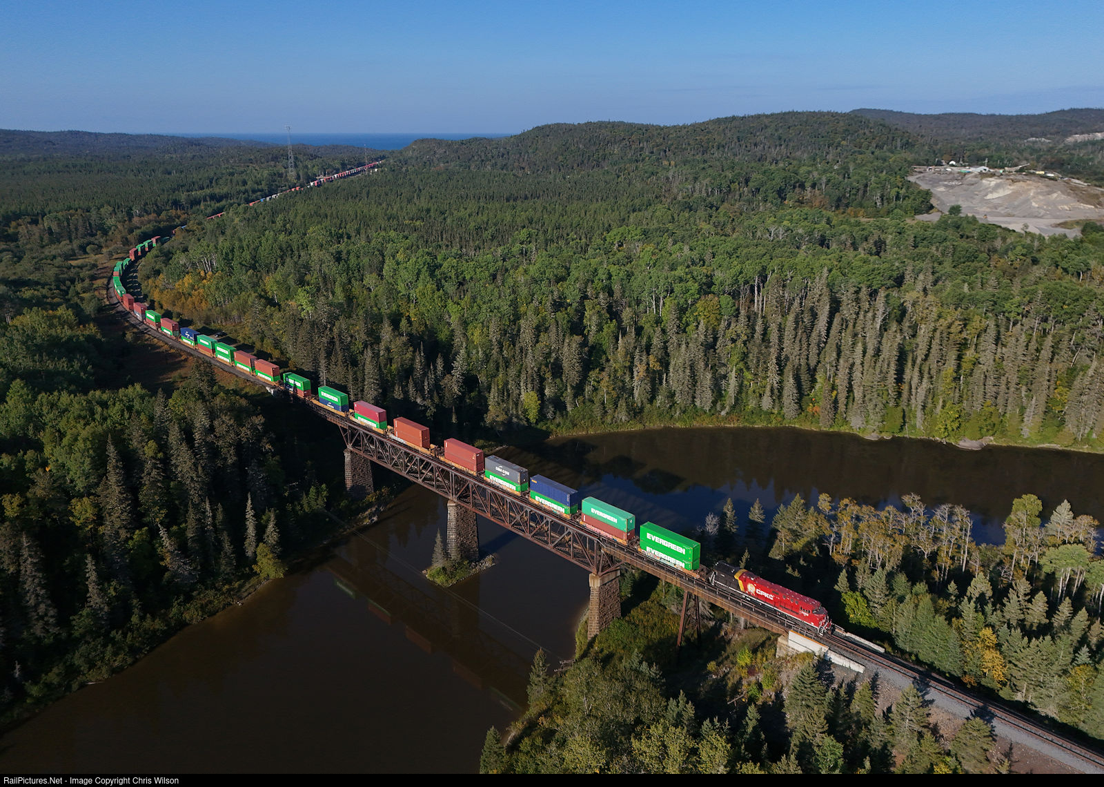 CPKC's Montreal to Vancouver intermodal train 113 clears the trestle over the Pic River approaching Heron Bay. Off in the distance is Lake Superior and the rails will run across the rugged north shore for 200 miles.