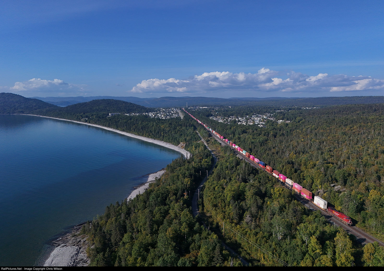 CP AC4400CWM 8174 is teamed up with CP ES44AC 9373 operating 1x1 on this 9500ft stack train making its way east down the main track at Marathon beside Pebble Beach.