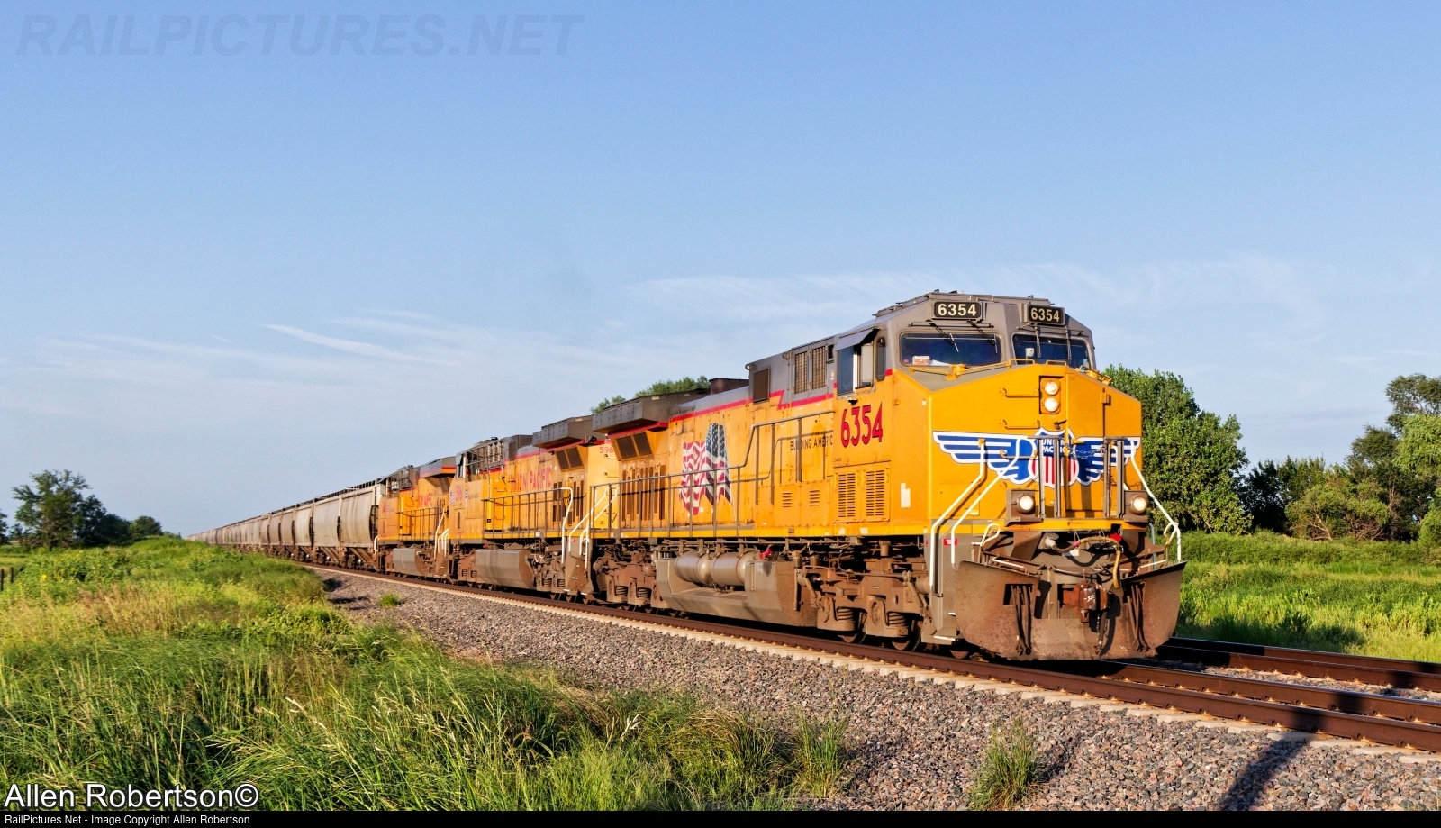 | UP 6354, 5961, & 7448 westbound with a unit grain train. |