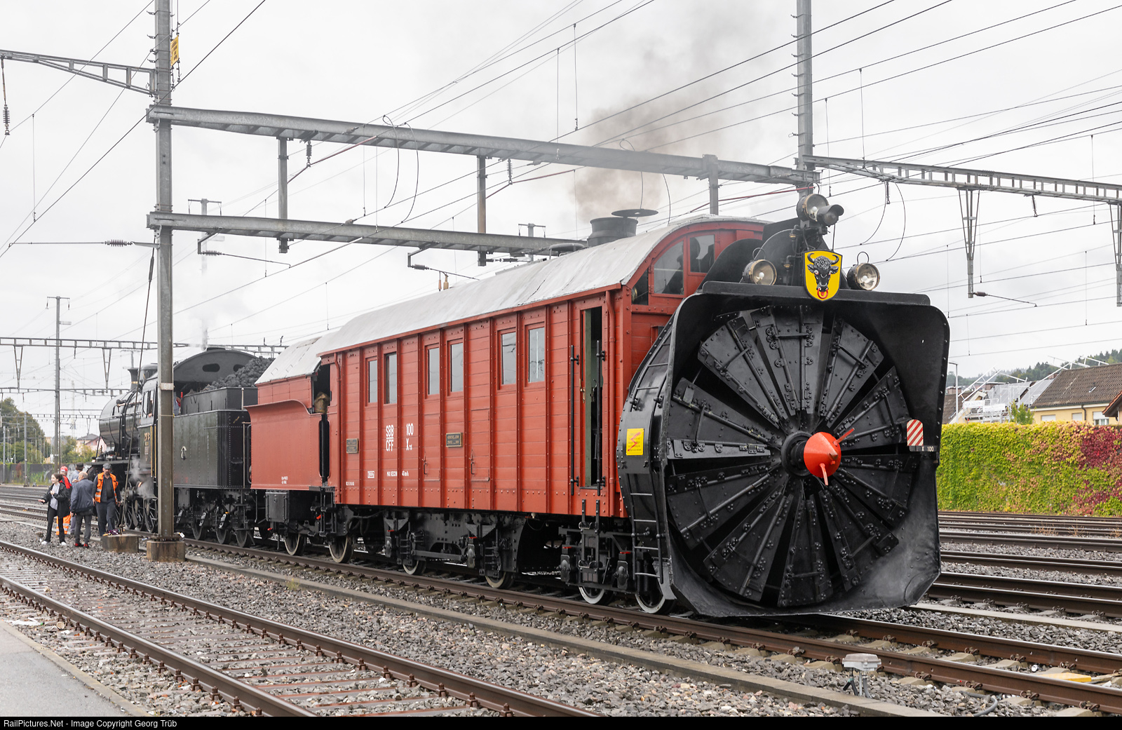 2-10-0 freight train steamlocomotive "Elephant" C 5/6 # 2978 of SBB Historic, based in Brugg AG, built by SLM in 1917, is on the way to Erstfeld with the steam rotary snow blower Xrot # 100. The train reached Wohlen for a control stop and greasing. The snow blower is under pressure.