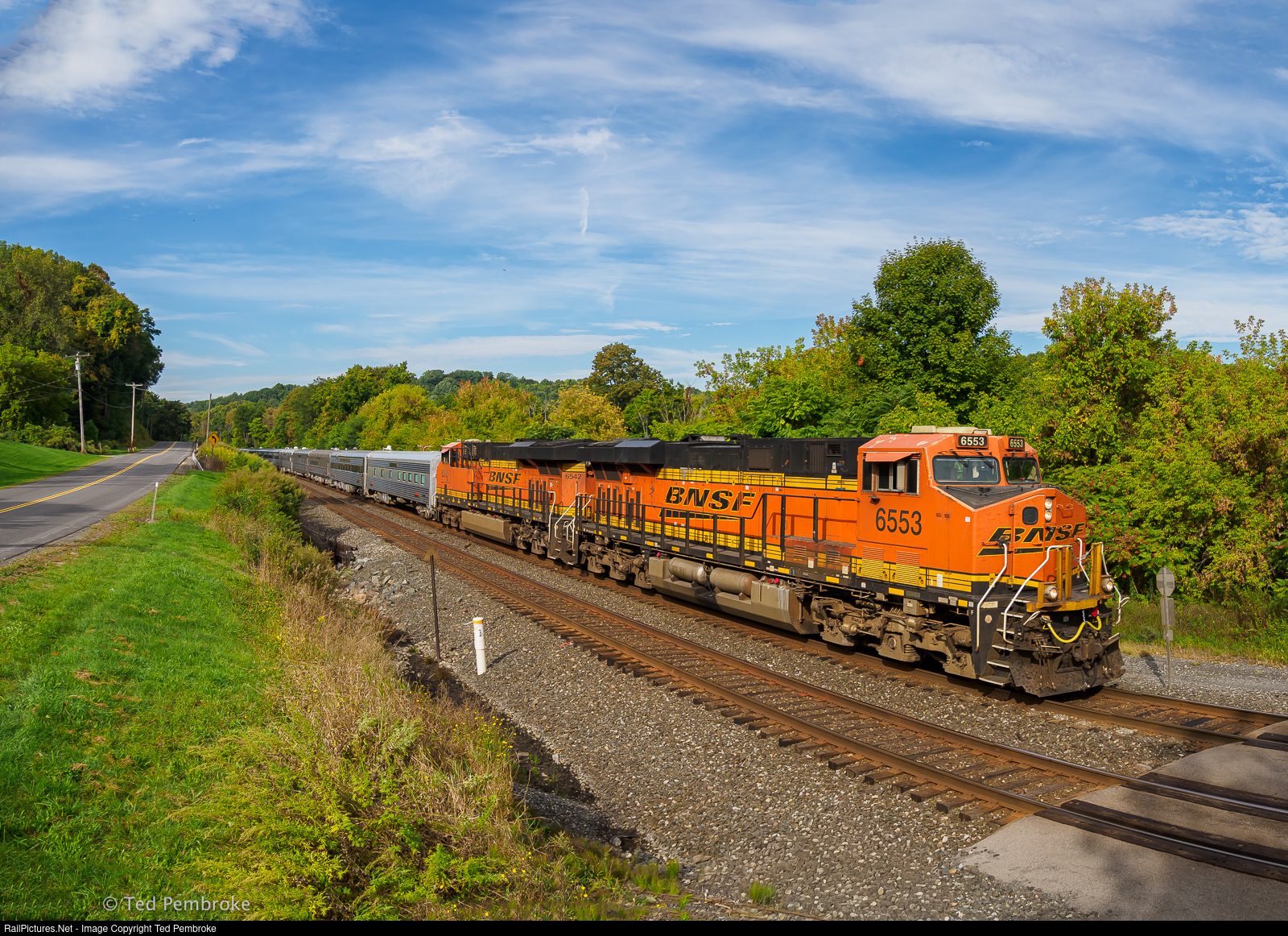 P976 a BNSF Office car special headed to provide accommodations at the Ryder Cup at Bethpage Black golf course on Long Island. Shot in East Palmyra on a beautiful crisp fall day. Pretty unusual to see BNSF Passenger cars on the CSX water level route. |