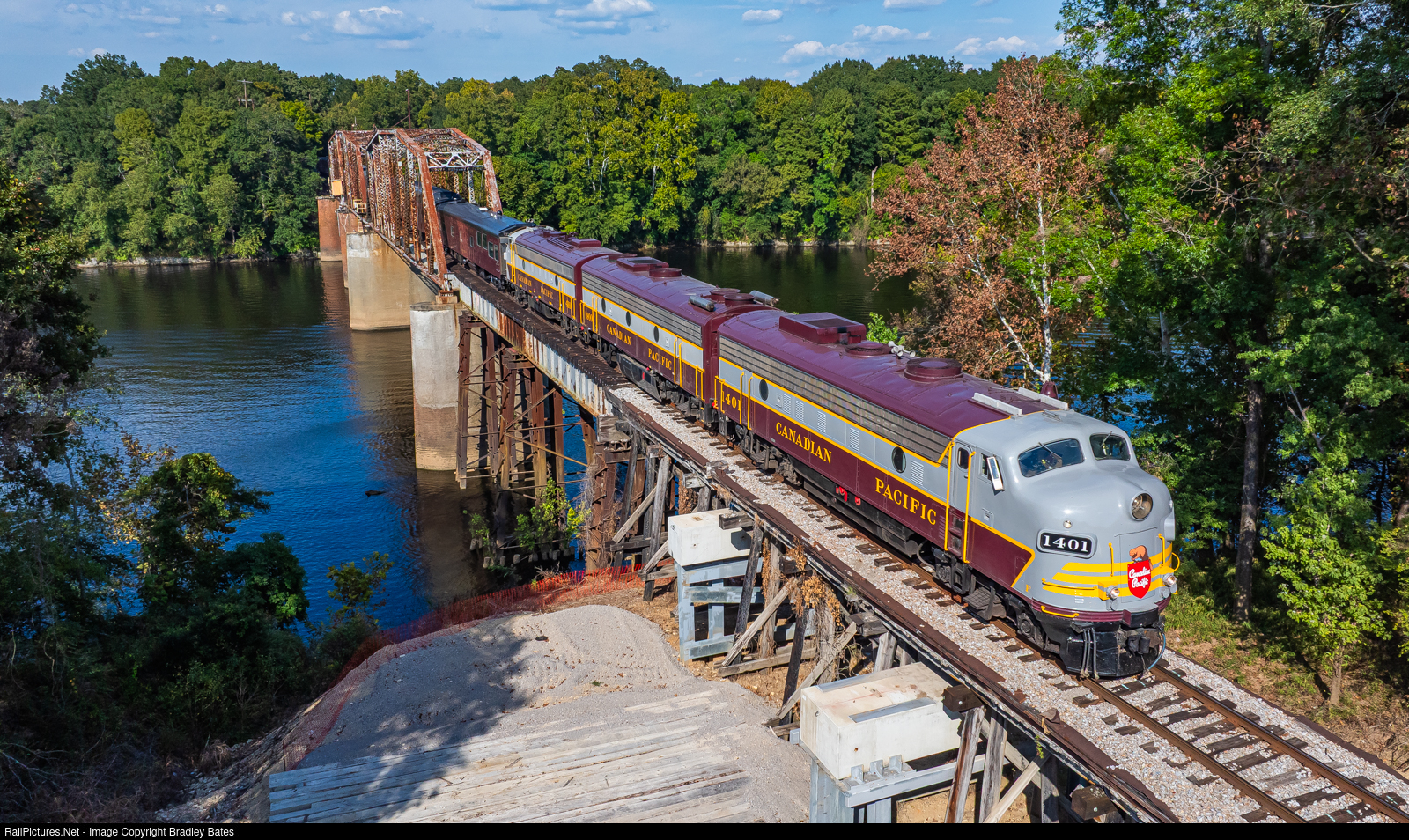 | Now running as CSX P991-14, CP F9 #1401 leads CPKC's deadhead move of the Office Car Special eastbound across the Alabama River at Selma, AL. on their way to Montgomery. |