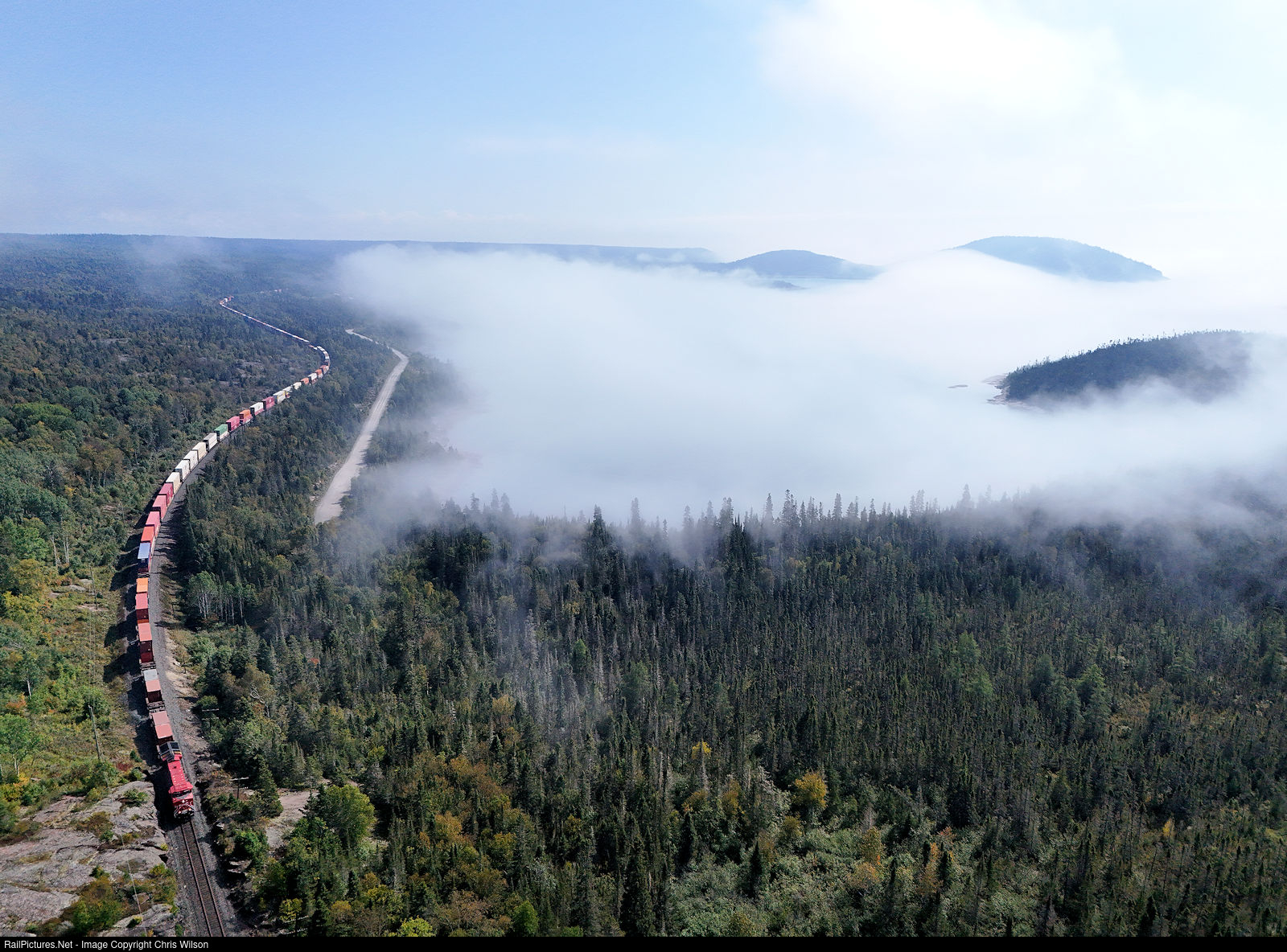 Fog develops off Lake Superior and hangs in Peninsula Bay as CPKC's hotshot Toronto to Calgary/Vancouver intermodal train 101 heads west.