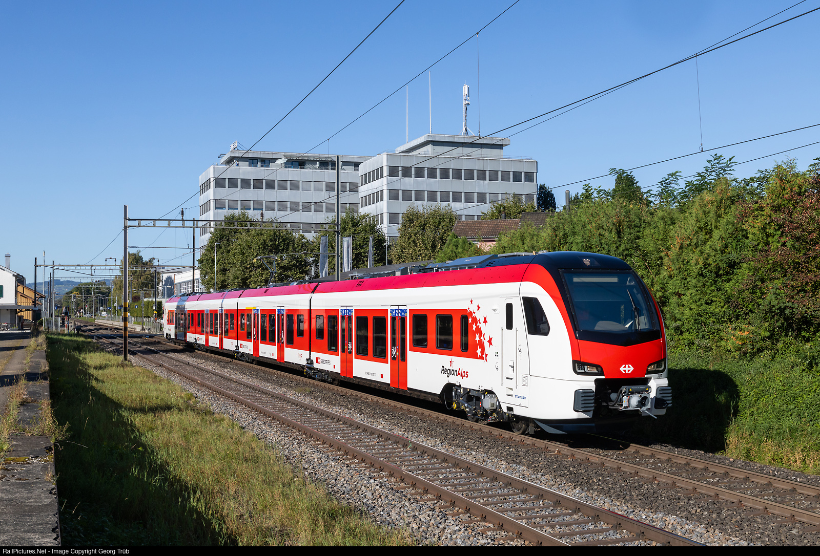| Brand new "Flirt Evo" RABe 533 # 707 from StadlerRail for RegionAlps is running through Erlen as test train 97339 from Sulgen to Romanshorn Süd. RegionAlps gets 24 of this new trains. |