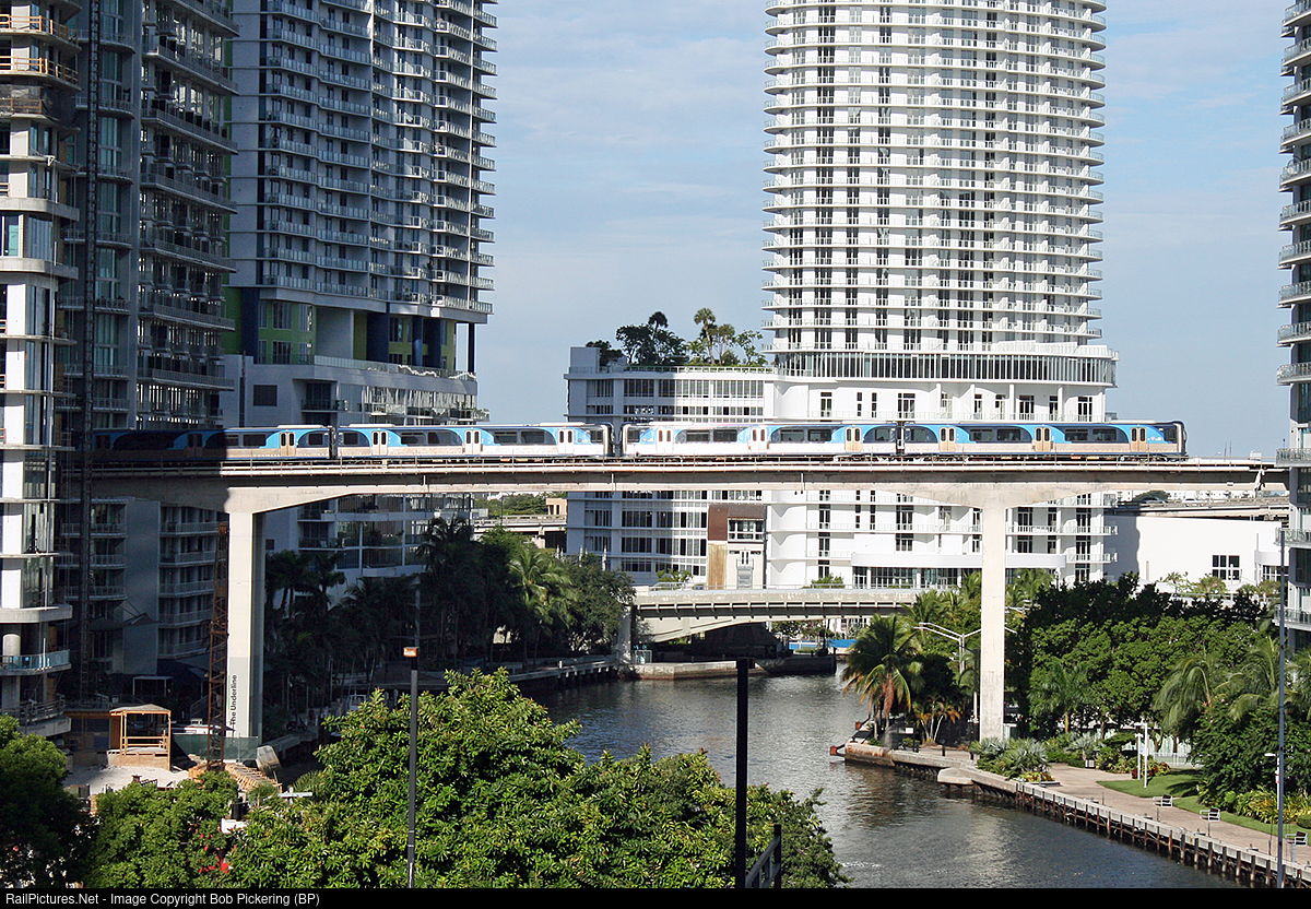 A Miami Metrorail Train passes high above the Miami River. Where the FEC once ran at ground level Metrorail soars.