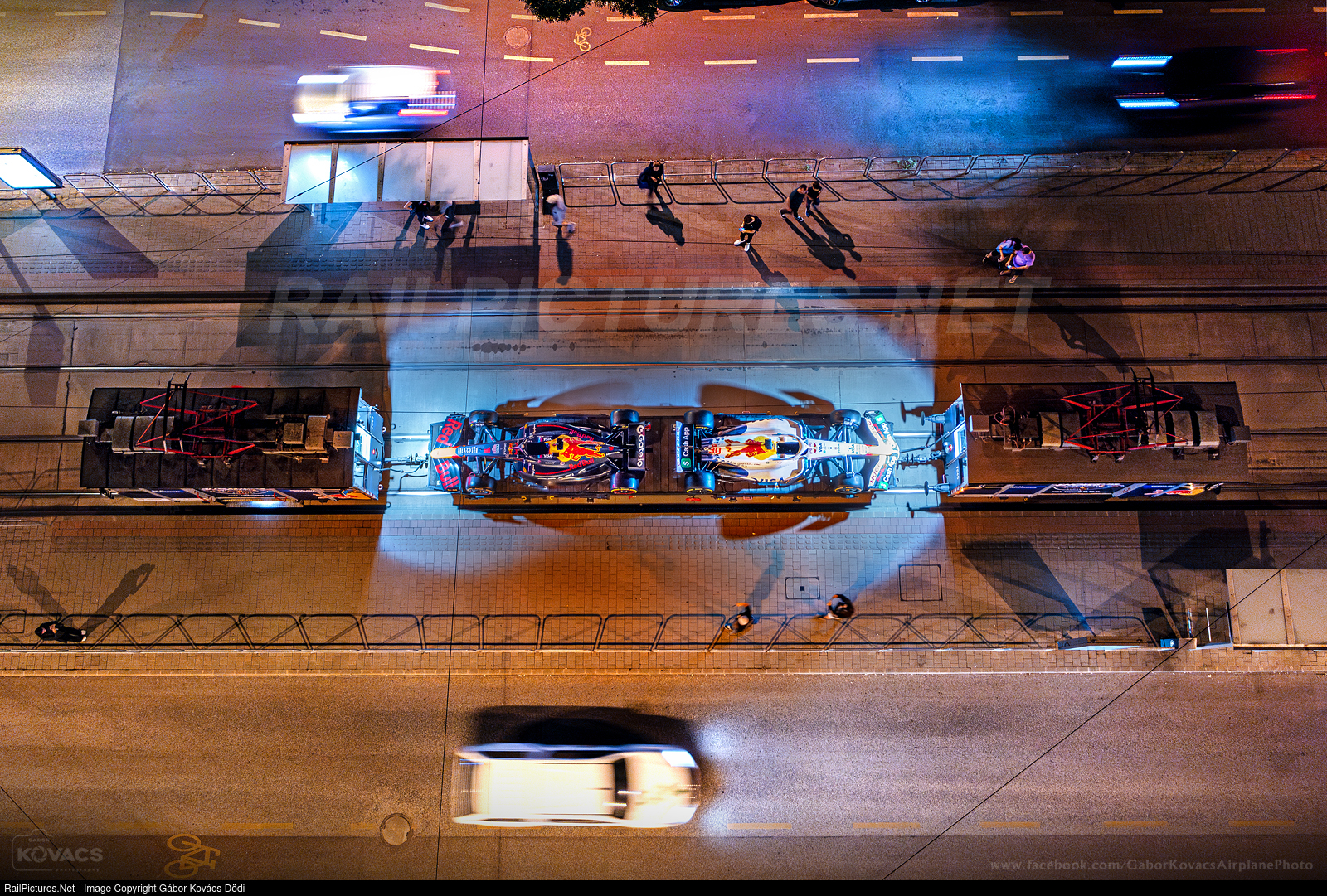 This special tram traveled along in Budapest for few days, carrying two Red Bull Formula 1 cars on its back to promote the Red Bull Showrun event in downtown Budapest. -1600 pix-