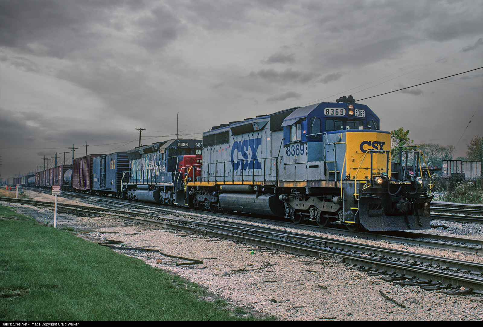 Rolling out of suburban Chicago's Dolton Yard is a CSX Transportation freight train powered by CSXT "SD40-2" 8369 (originally Chesapeake & Ohio SD40 7510, which was rebuilt by VMV of Paducah KY to SD40-2 specifications) and CEFX "SD45R" 9486 (ex-Southern Pacific "SD45R" 7486, née-SP SD45 9045). No matter where one goes in the Chicago area, one can always find some rail action without looking too hard! (Dolton, Illinois – October 23, 2000)