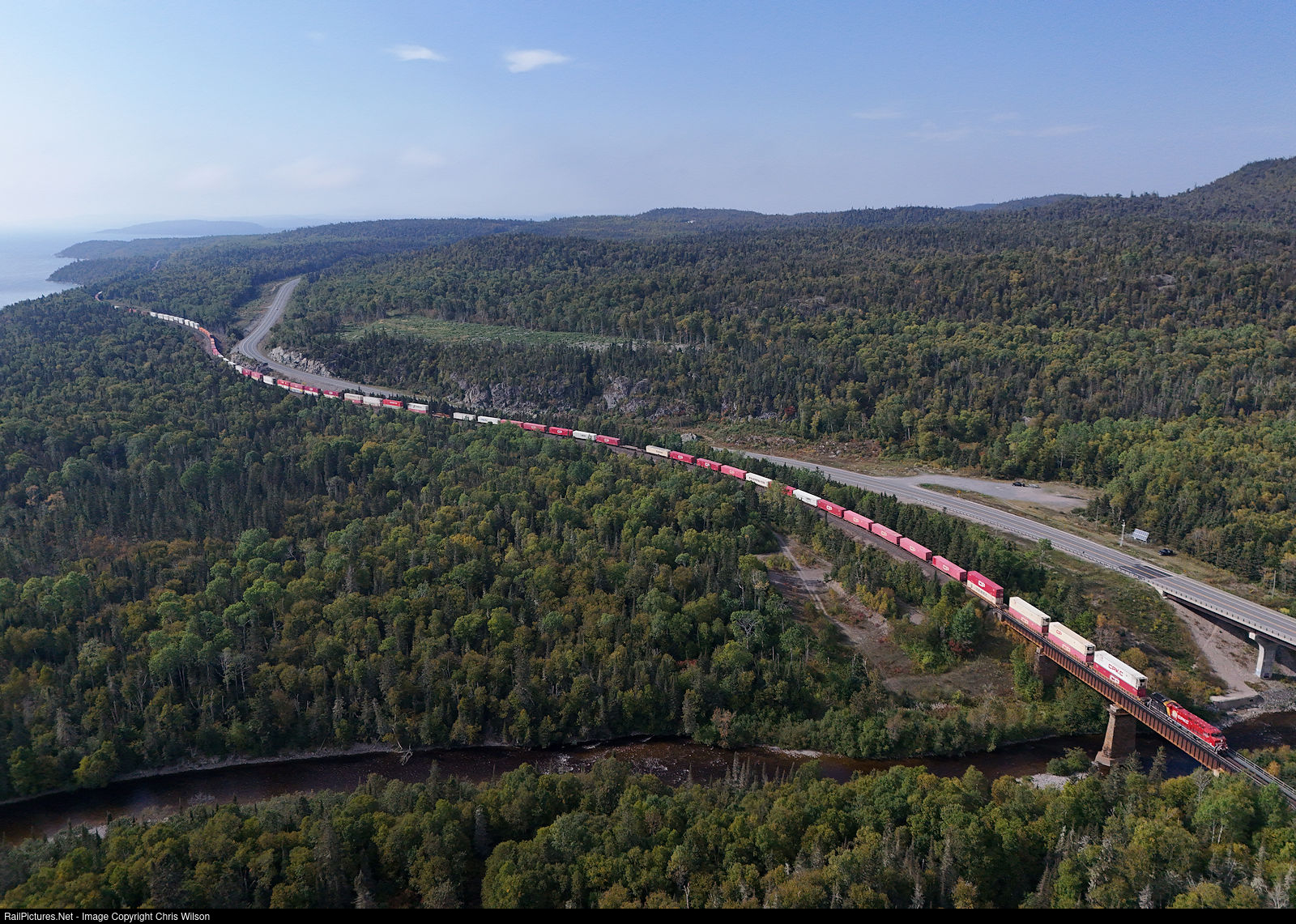 | CP ET44AC 7475 snakes out of Jackfish alongside the Trans Canada Highway after meeting 101 and crosses over the Steel River bridge. Fall is in the air as the leaves slowly begin to change colour along the north shore of Lake Superior. |