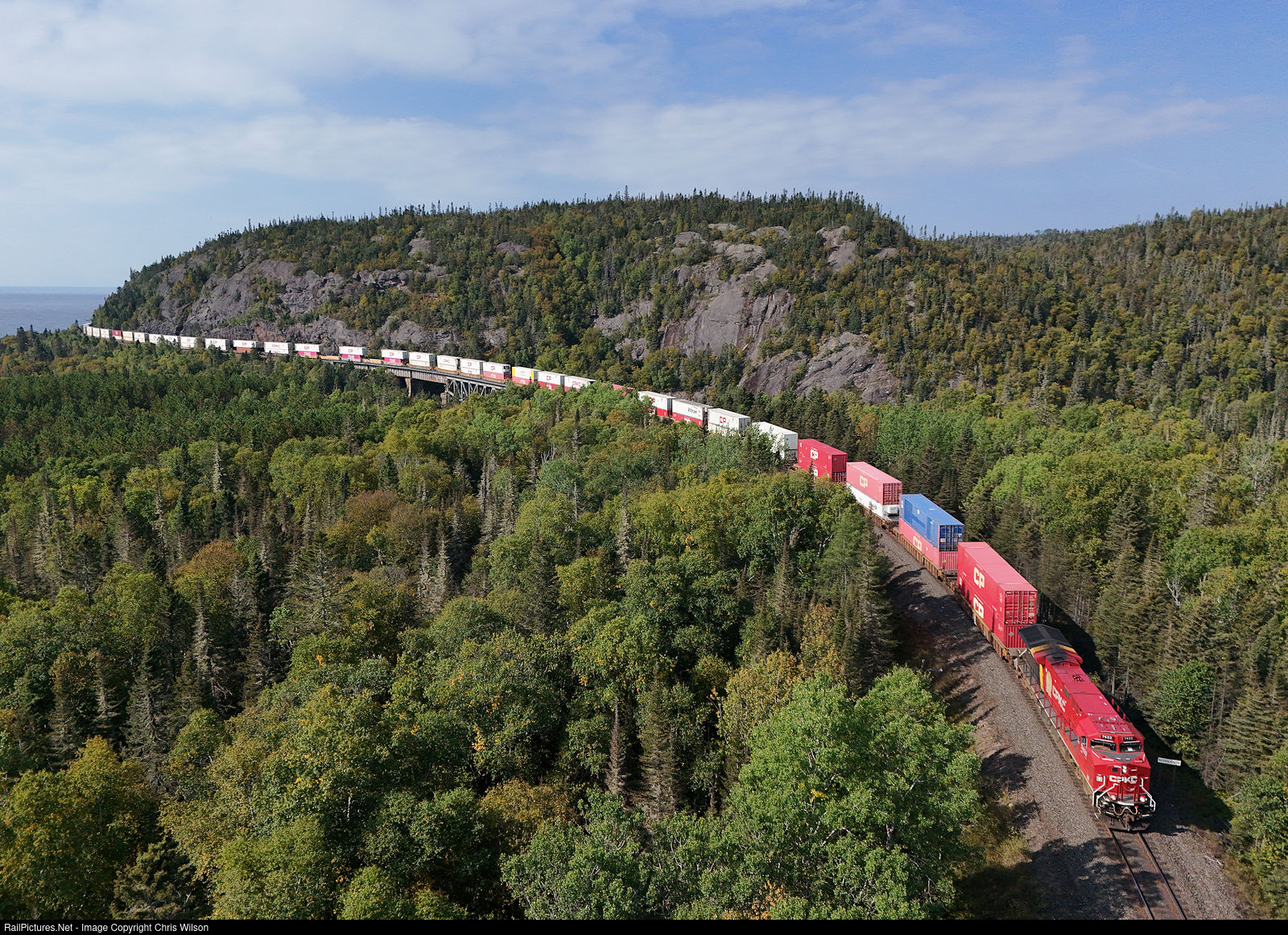 | CPKC's domestic IMS train from Edmonton, AB to Montreal, PQ crosses the trestle over the Little Pic River at the shores of Lake Superior one mile east of Middleton. Fall is in the air as leaves begin to change in Superior Country. |