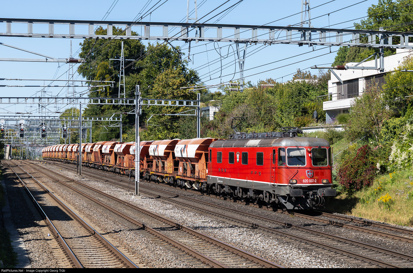 | Re 620 # 037 (Re 6/6 # 11637) "Sonceboz-Sombeval" of the SBB pulls the loaded HOLCIM gravel train 67481 from Hüntwangen-Wil via Bülach-Winterthur to Bürglen, between Winterthur and Oberwinterthur. |