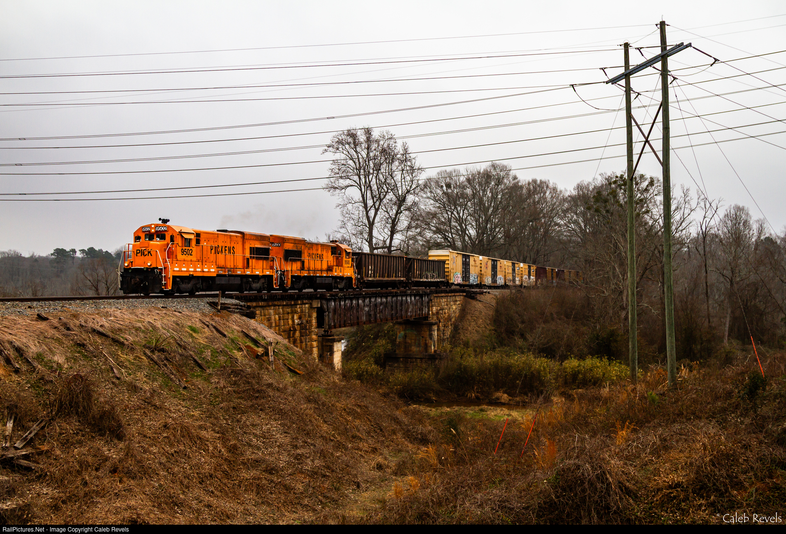 | Pickens U18B's #9502 & 9500 bring the Belton Job back from Belton, entering Anderson crossing the Rocky River. They would exchange cars with the Anderson Job south of the NS interchange before continuing down to Gluck and calling it a day. |