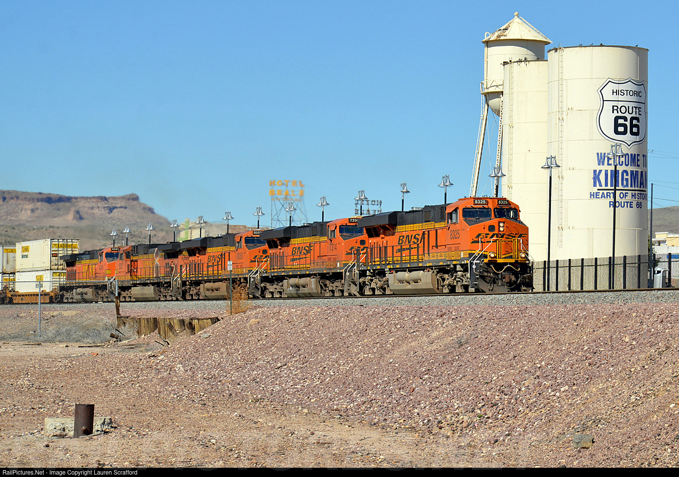 BNSF 8325 E/B Intermodal at Kingman, AZ on October 9, 2015 with BNSF 7314, 8050, 5527 & 4341 with a JB Hunt Double Stack Intermodal. This train had just come out of Kingman Canyon and was on its way following the original Route 66. The old ATSF Kingman Depot is behind the double stacks.