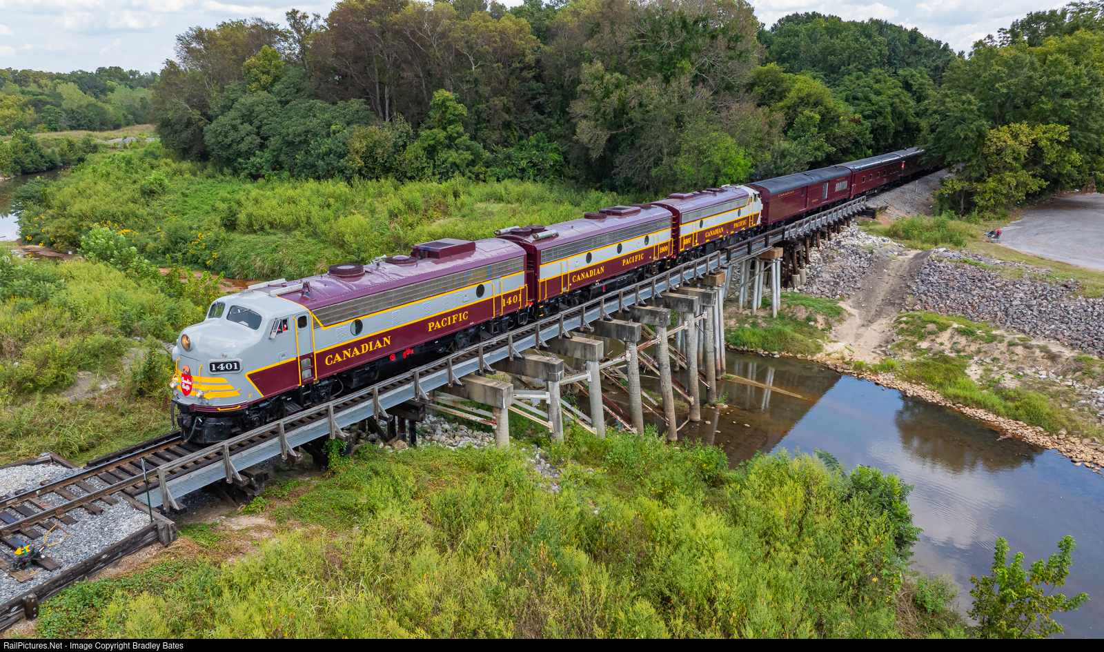 Running as CPKC 41B, the Canadian Pacific F-units lead the CPKC Office Car Special across Sowashee Creek in Meridian, MS. as they work westbound to Jackson, MS. where they'll layover for the night before continuing west to Shreveport, LA.