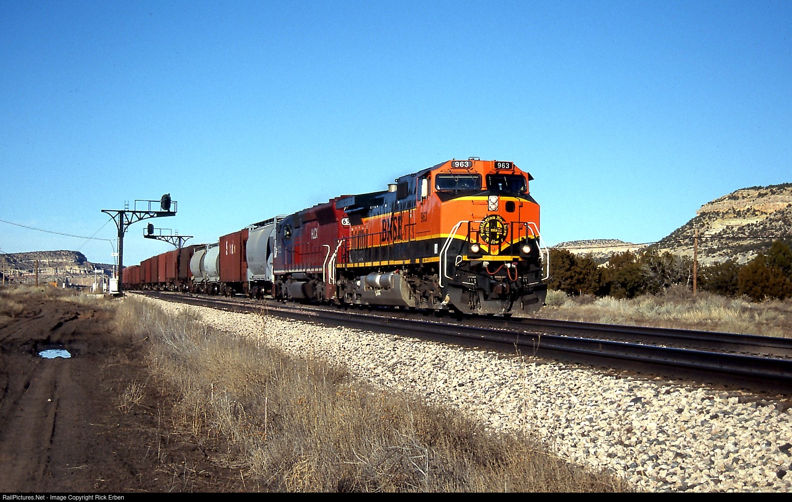 BNSF 963 sails into Arizona passing the cantilever signals at Lupton. This was left hand running territory for many moons before CTC was installed on the 2nd District circa 2001. Helm Leasing SD40M-3, an ex-SD45, trails the fine looking H1 leader. Fuji Astia.