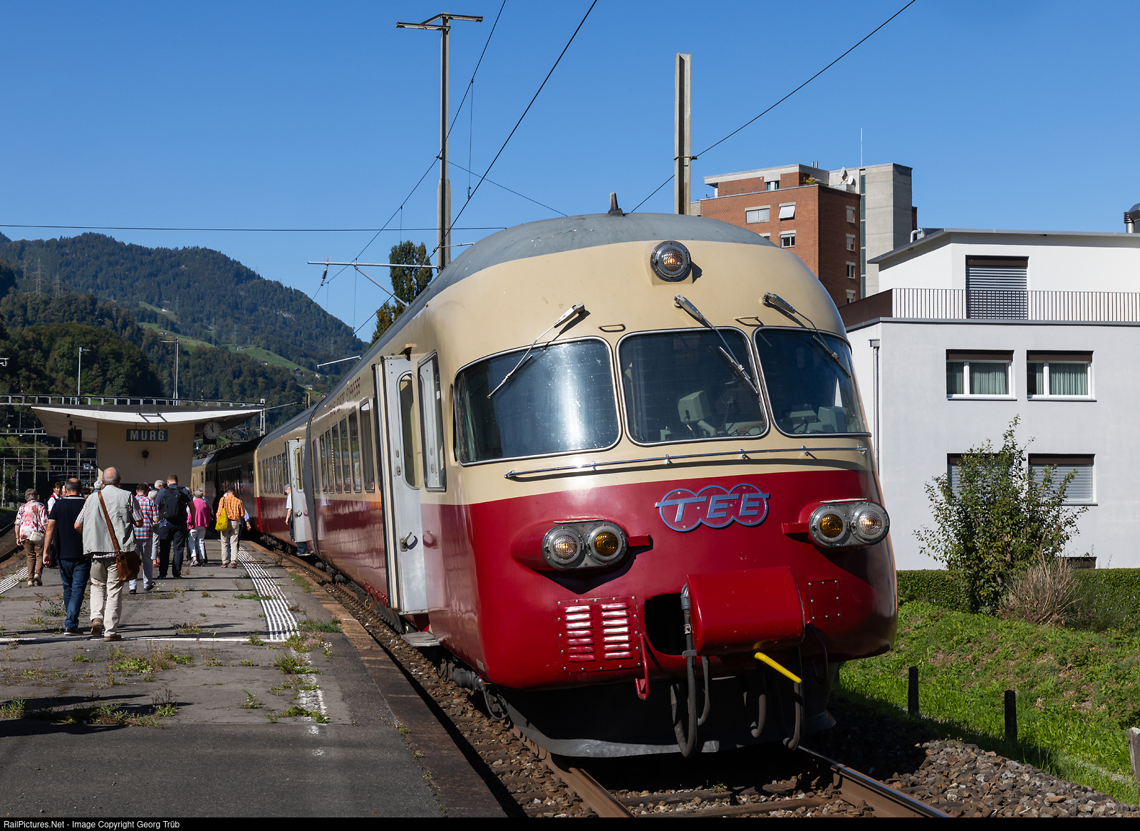 | The train has arrived at its destination in Murg on the shore of the Walensee (Lake Walen) on the traditional annual special trip for patrons of RAe TEE II # 1053 from SBB Historic. Passengers headed to the nearby Sagibeiz restaurant for drinks and lunch. This year's trip started in Olten and went via Brugg-Zurich-Wallisellen-Pfäffikon ZH-Rapperswil-Pfäffikon SZ-Ziegelbrücke to Murg, from where the train continued empty to Unterterzen and later back to Weesen. After lunch, the train departed from Murg via Sargans to Buchs SG for a stopover, and later through the St. Gallen Rhine Valley (home of the Chairman of the Board of Directors of SBB Historic) via St. Margrethen-Romanshorn VL-Frauenfeld-Winterthur-Zurich back to Olten. The timeless elegant six-car TRANS EUROP EXPRESS train RAe II # 1053 was built in 1961 by SIG and MFO for SBB and was a technical pioneer with a maximum speed of 160 km/h and the ability to run on all four power systems in Europe.