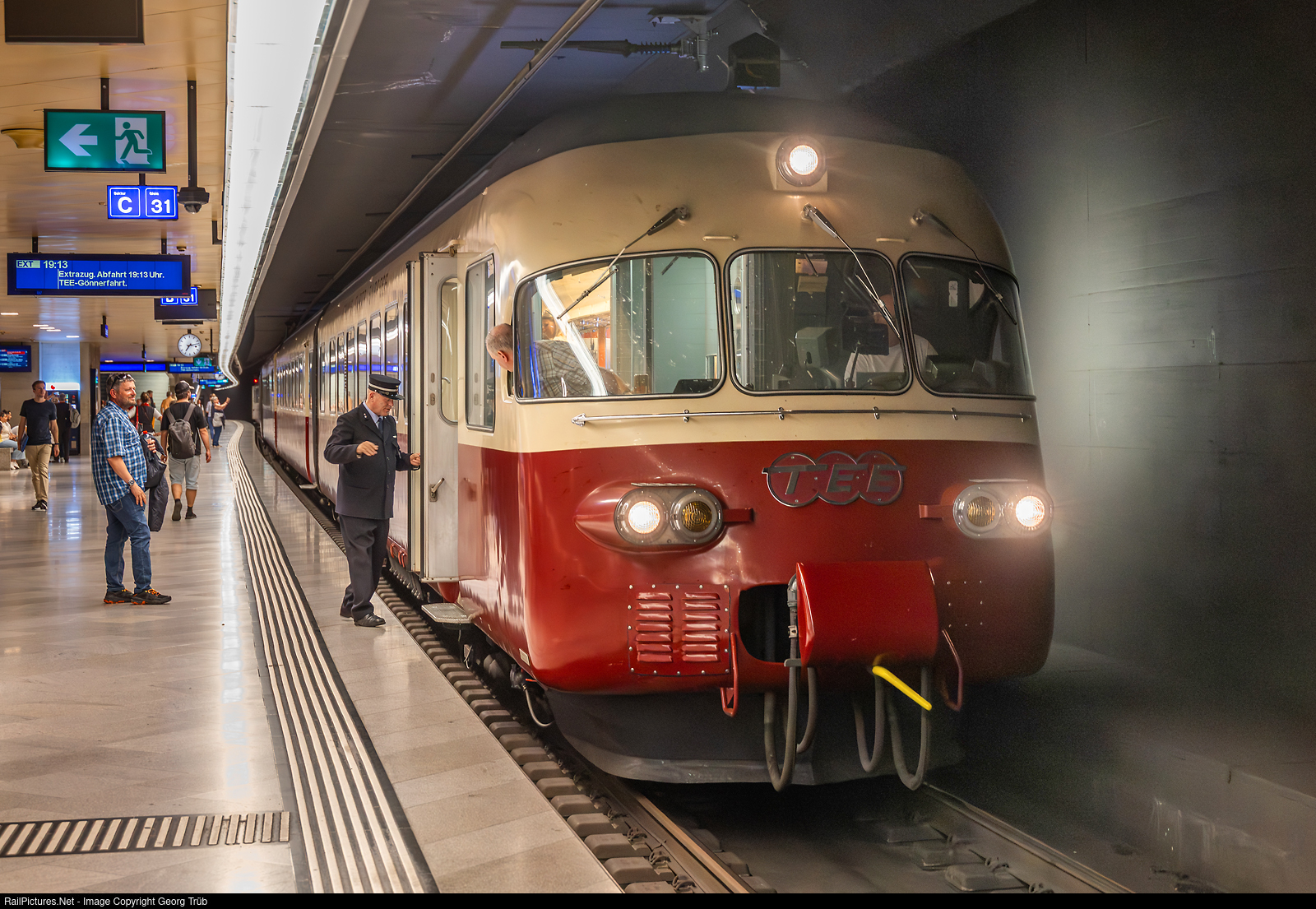 | The train has arrived back in Zurich on its traditional annual special trip for patrons of SBB Historic's RAe TEE II # 1053 and will continue on to Olten shortly. Many of the passengers have disembarked here. Train conductor Zambelli is just boarding, while the second train driver, Schärlinger, looks back. This year's trip started in Olten and went via Brugg-Zurich-Wallisellen-Pfäffikon ZH-Rapperswil-Pfäffikon SZ-Ziegelbrücke to Murg. After lunch, the train departed from Murg via Sargans to Buchs SG for a stopover, and later through the St. Gallen Rhine Valley (home of the President of the Board of Trustees of SBB Historic) via St. Margrethen-Romanshorn VL-Frauenfeld-Winterthur-Zurich back to Olten. The six-car TRANS EUROP EXPRESS train RAe II # 1053 was built in 1961 by SIG and MFO for SBB and was a technical pioneer with a maximum speed of 160 km/h and the ability to run on all four power systems in Europe.