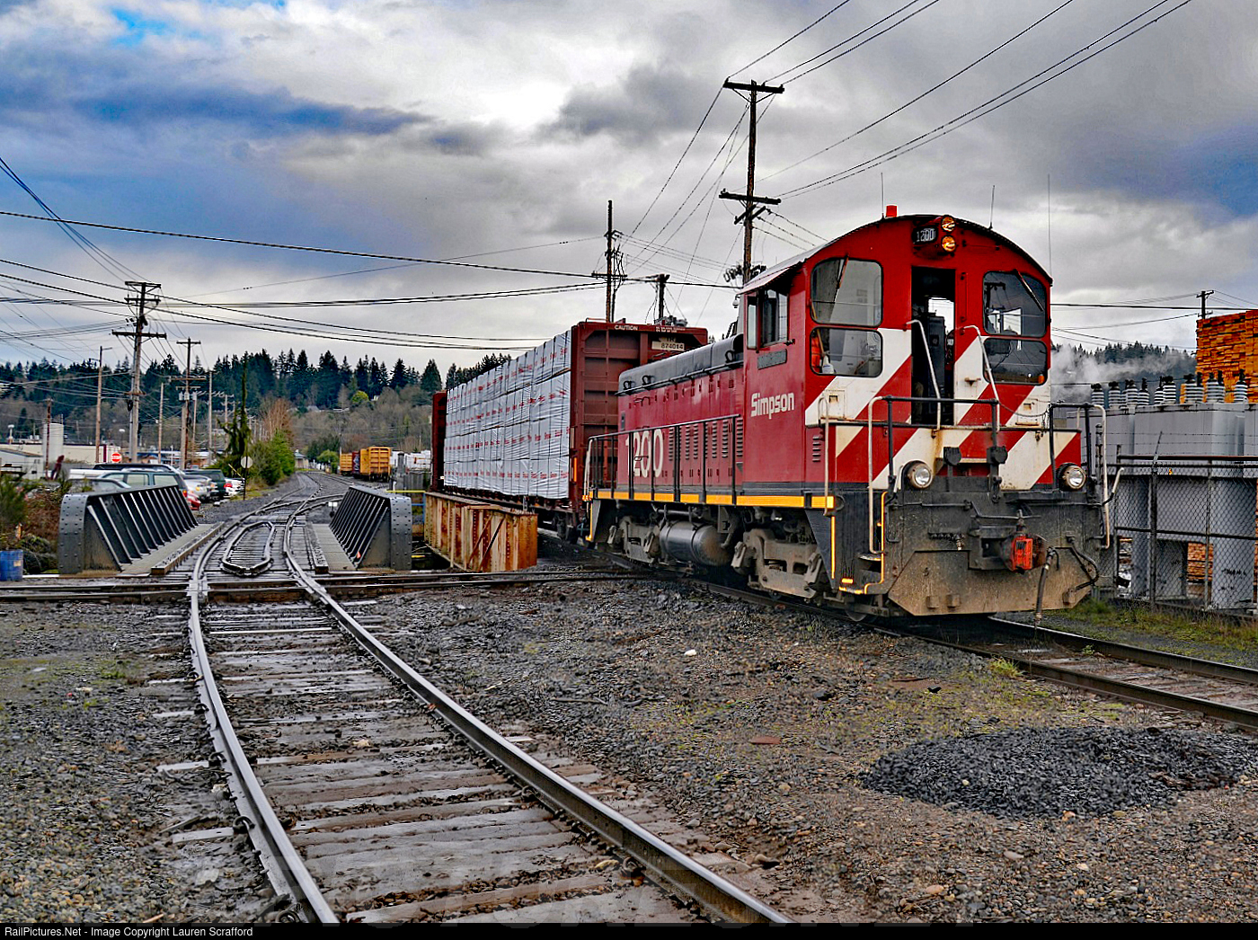 Simpson Railroad, STC 1200 pulling 5 carloads of finished lumber out of the Shelton, WA mill on February 29, 2013 for interchange with the Puget Sound and Pacific RR. This was after an early spring rain in Shelton and was clearing off for a nice day. The STC 1200 is crossing over Goldsborough Creek and the line to the wharf. Track to the left is the PSAP main.