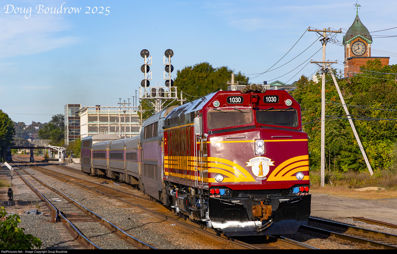 | MBTA 1030, recently painted in a Boston & Maine heritage scheme is seen leading outbound train 5217. The train is passing through Lawrence and crossing over at CP-FR (Frost). The 267 foot tall Ayer Mill clock tower looms in the background and is the biggest mill clock tower in the world. |