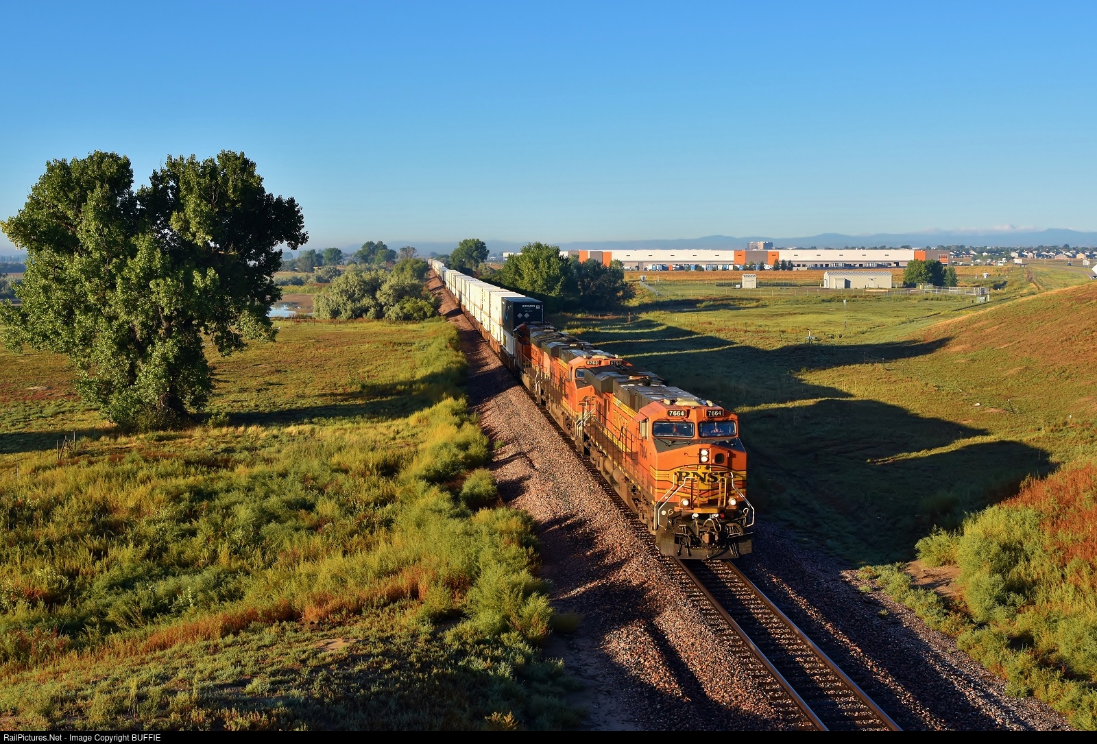 | A bright Colorado sunrise greets BNSF 7664 (ES44DC) as it leads a stack train through Tonville, Colorado on the Brush Sub.