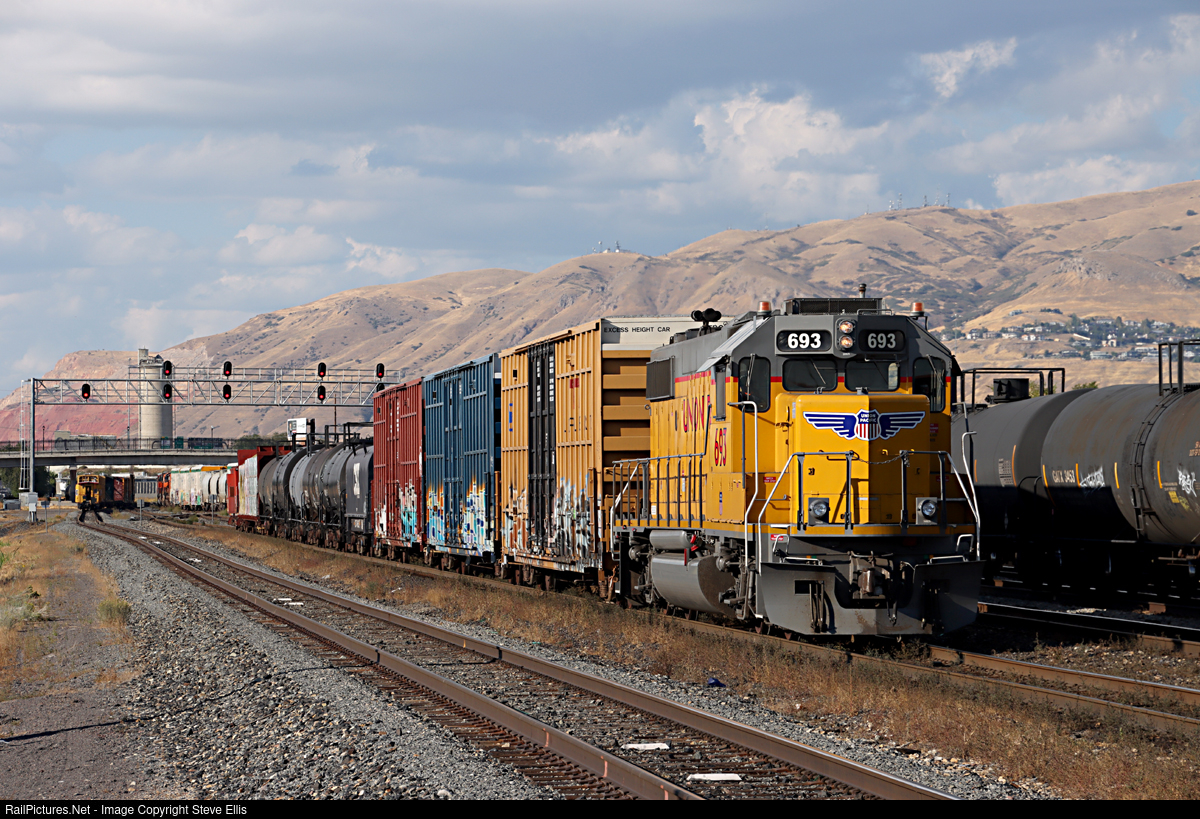 | Stuck in the middle. I not sure exactly which local this is. But UP 693 with a MP shoving platform has just back out of Roper yard. The BNSF Provo to Stockton is departing on the out side. And the LUE43 with shoving platform SP 4747 is push back in on the inside. The Chevron has just entered the yard. Utah Railway RUT312 is in Roper wait for a chance to leave, along with a UP freight. Also two UP GP38's are moving around also. Rush hour at Roper. Not to often these days you can get a shot with two caboose/shoving platforms. |