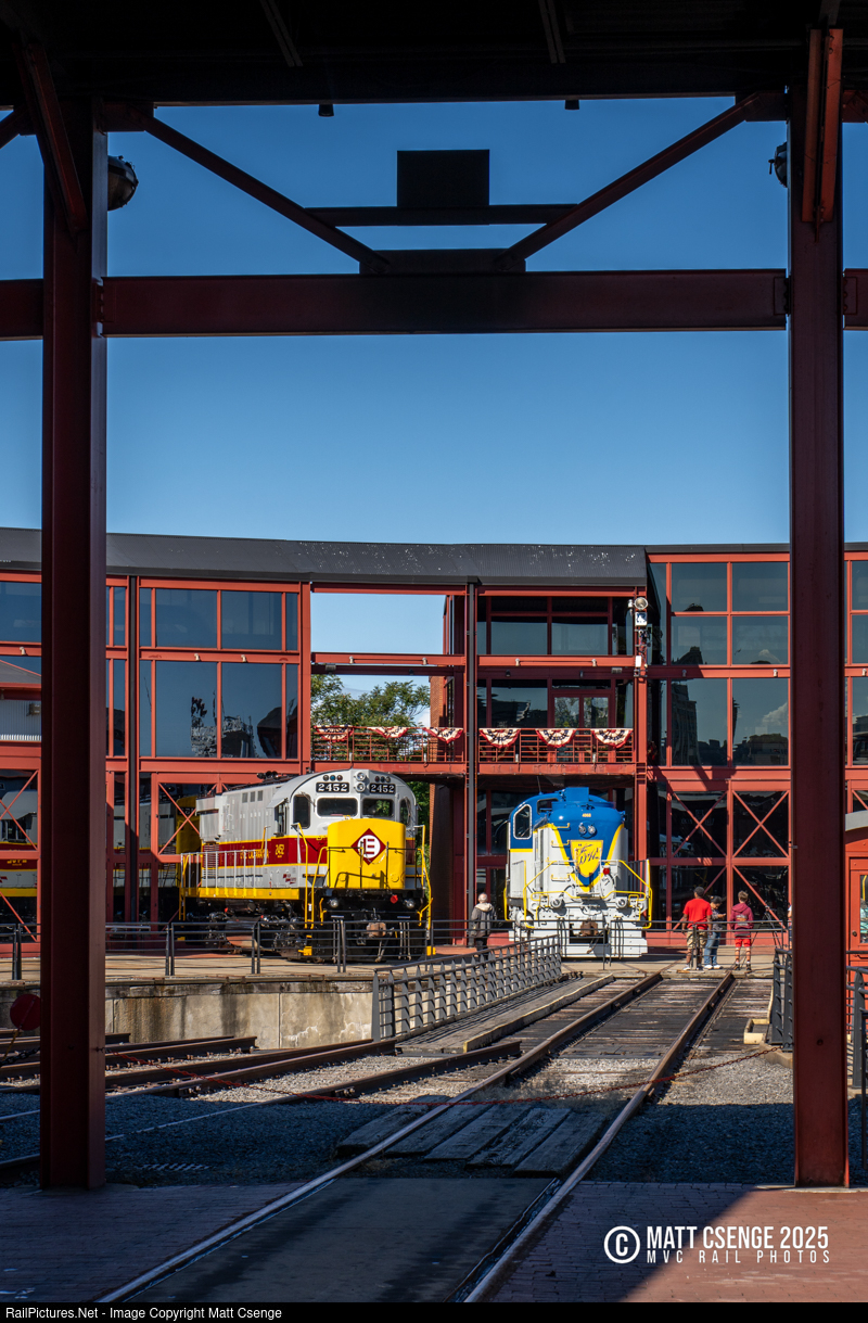 Railfest 2025 at Steamtown National Historic Site included multiple locomotives graciously lent by the local short line, the Delaware-Lackawanna (DL). The railroad is well-known as a haven for diesels built by the American Locomotive Company (ALCO), rebuilding and operating the less-common and in some cases rare locomotives on a daily basis. Here we see two of their locomotives on display in fresh heritage schemes: C425 no. 2452 in Erie Lackawanna (EL) paint, and RS3 no. 4068 in resplendent Delaware & Hudson blue and gray. |