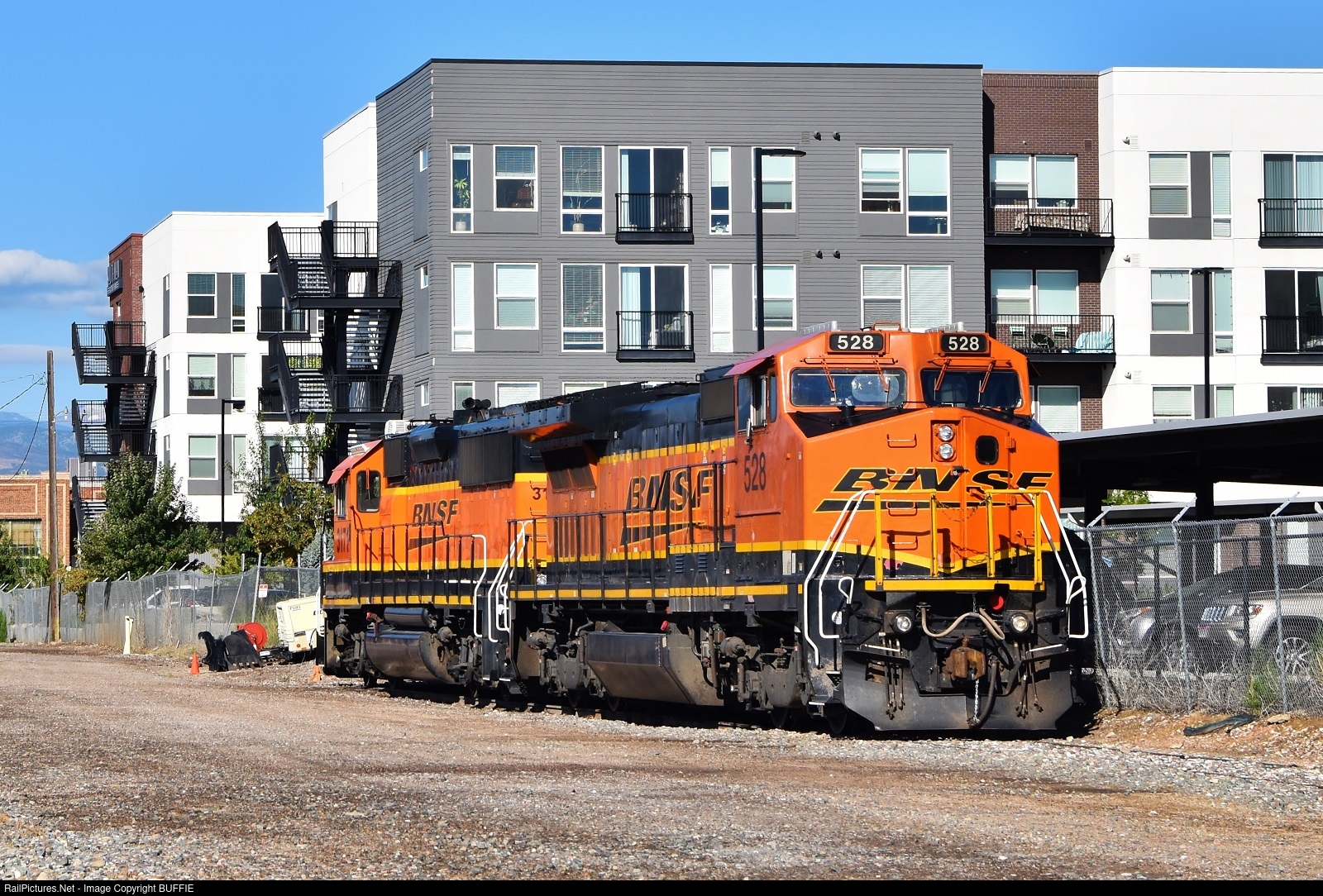| Former AT&SF Warbonnet BNSF 528 (B40-8W) sits at the depot in Longmont, Colorado waiting for orders to head to Fort Collins.