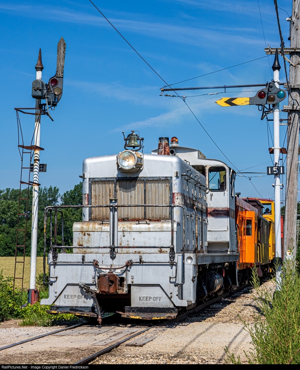 | ComEd 15 (SW1) splits the semaphores at the Karstens crossing while leading the caboose train during the Illinois Railway Museum's 2025 Diesel Days event. |