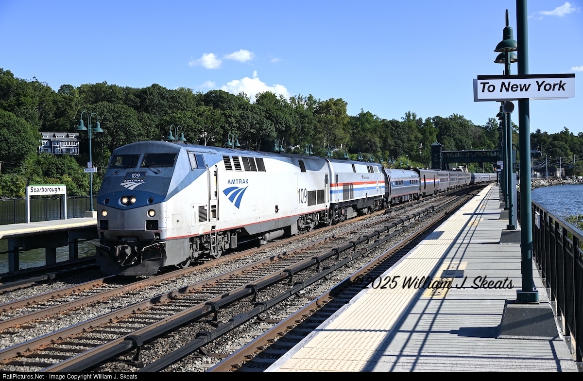 | Lake Shore Limited races along the platform at Scarborough staying on time for its next stop at Croton Harmon. P42DC 109, P32AC-DM 701 and ten cars. |