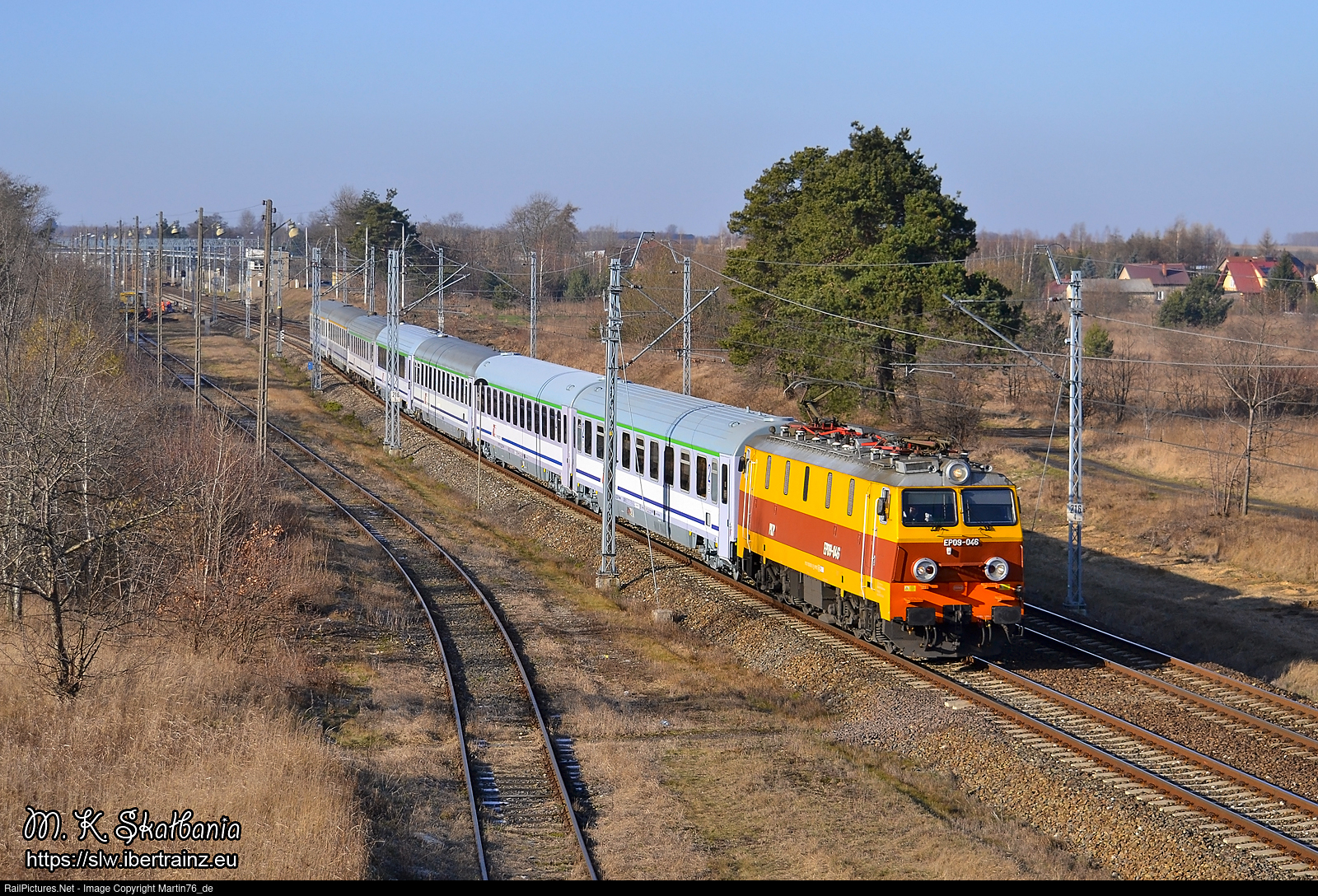 The electric locomotive EP09-046 hauling a passenger train IC Pilecki from Raciborz to Warszawa Wschodnia.