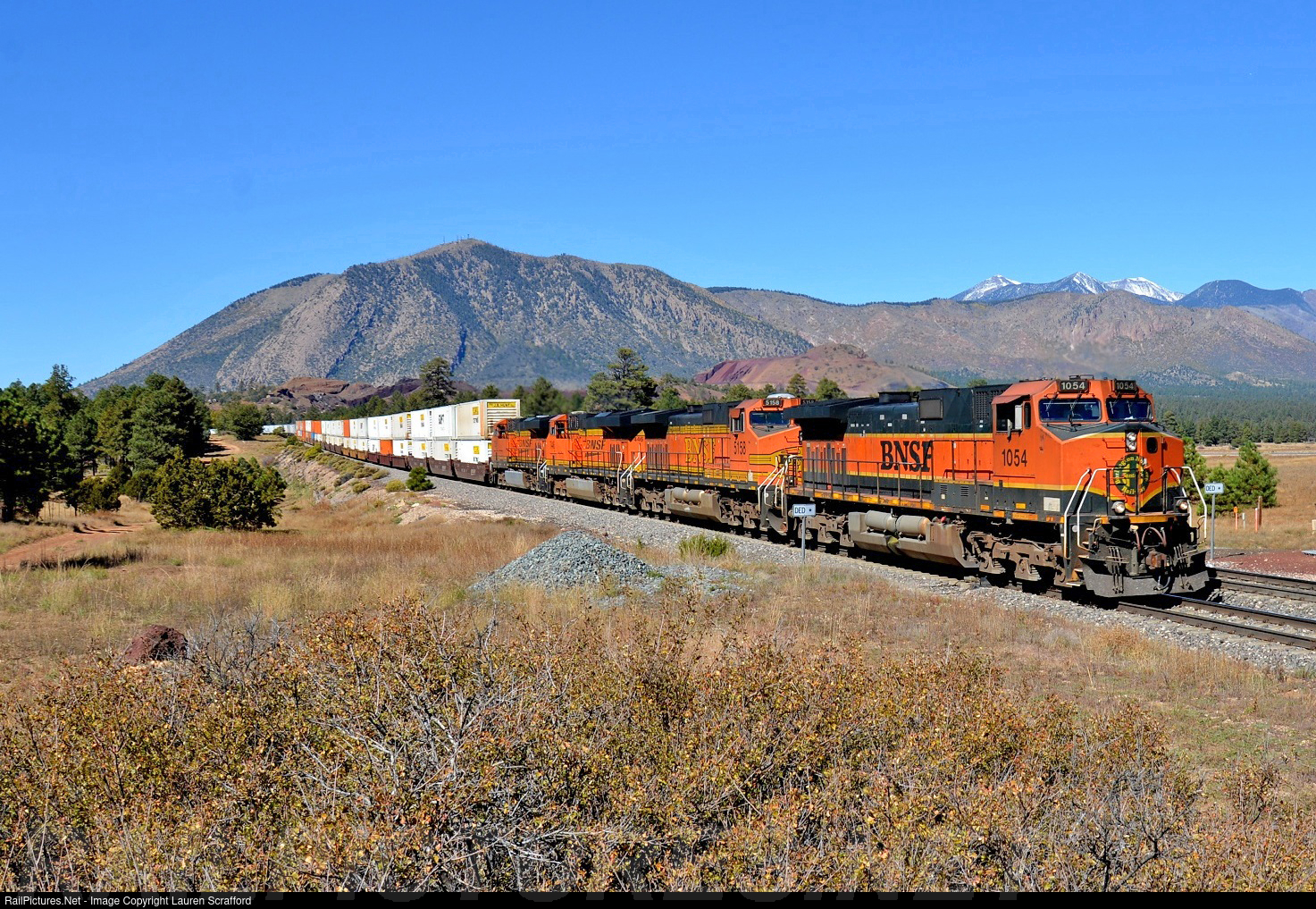 BNSF 1054 E/B Intermodal near Railhead, AZ on October 12, 2013, with BNSF 5158, 7446 & 7205. This was mostly JB Hunt, Schneider and Swift containers just east of Flagstaff with the San Francisco Mtns. in the background.
