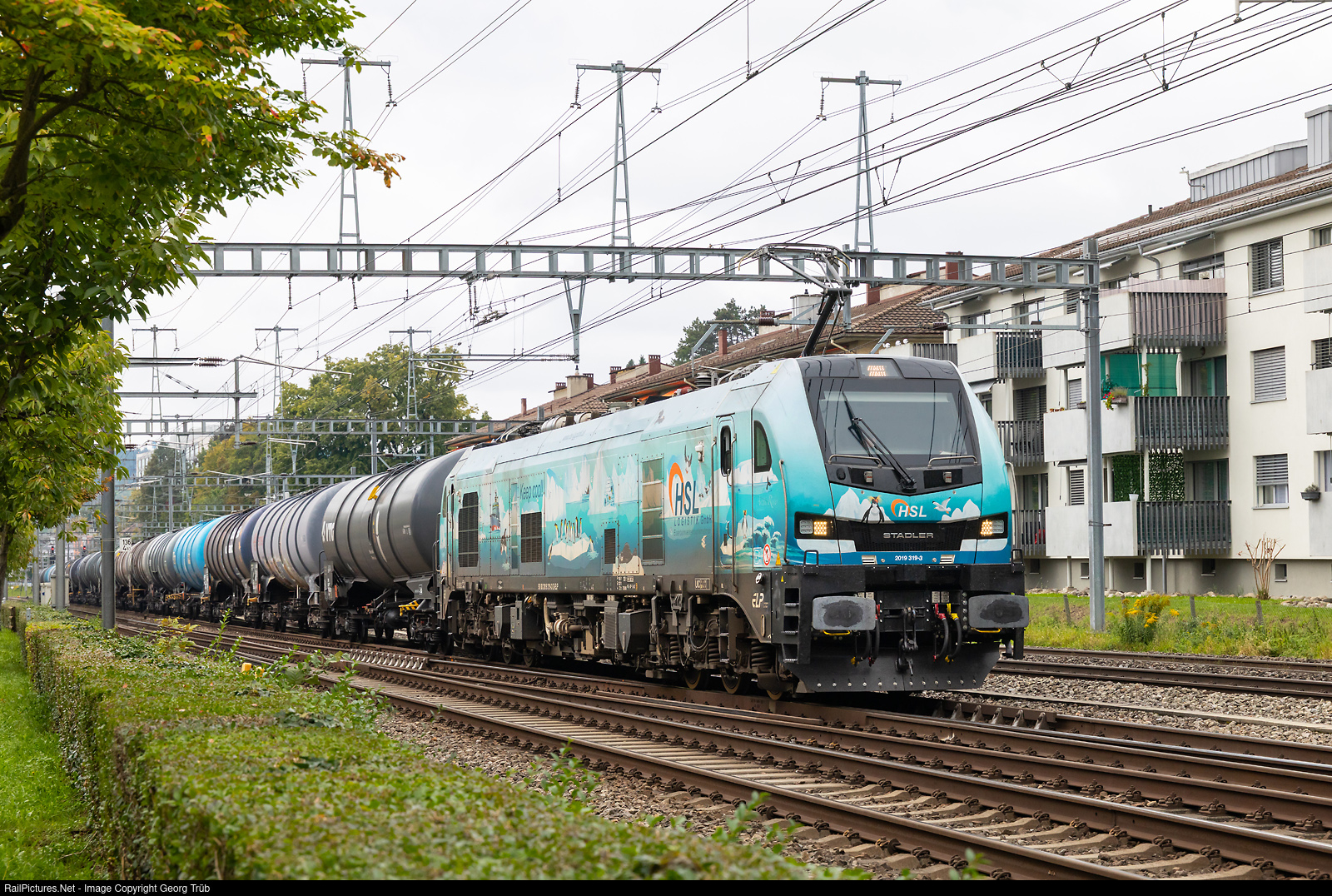 | About 2 1/2 hous late, the StadlerRail built Euro9000 locomotive 2019 # 319 "Artic Rider" of the European Loc Pool (ELP), rented to TXLogistik, pulls the loaded tank car train 48681 from Stendell (PCK reffinery)/Germany via Basel-Bözberg-Birr-Mägenwil-Zürich Altstetten-Kloten-Winterthur to Wil freight yard (-Tägertschi fuel depot at Bettwiesen), between Winterthur and Winterthur Grüze. |