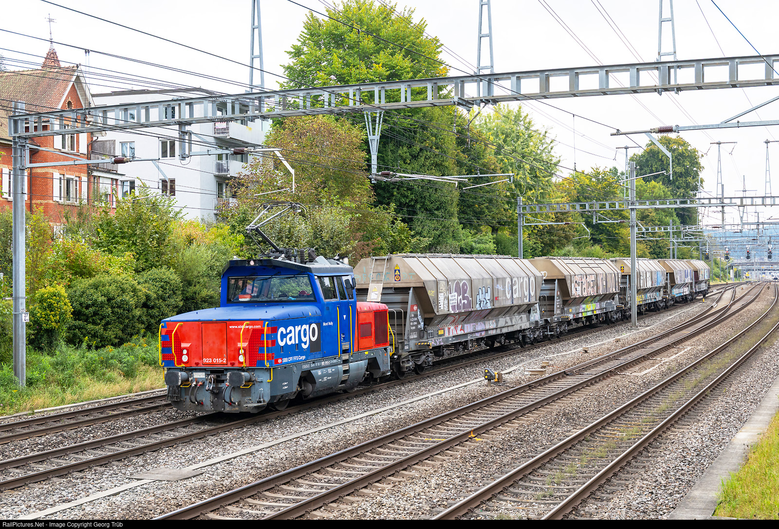 | The dual-system locomotive (electric and diesel drive) Eem 923 # 015 "Mont Vully" built by StadlerRail for the SBB pulls the approximately 450-ton train 65564 with 5 grain silo cars Tagnpps from Thalheim-Altikon to Winterthur freight yard, between Oberwinterthur and Winterthur. |
