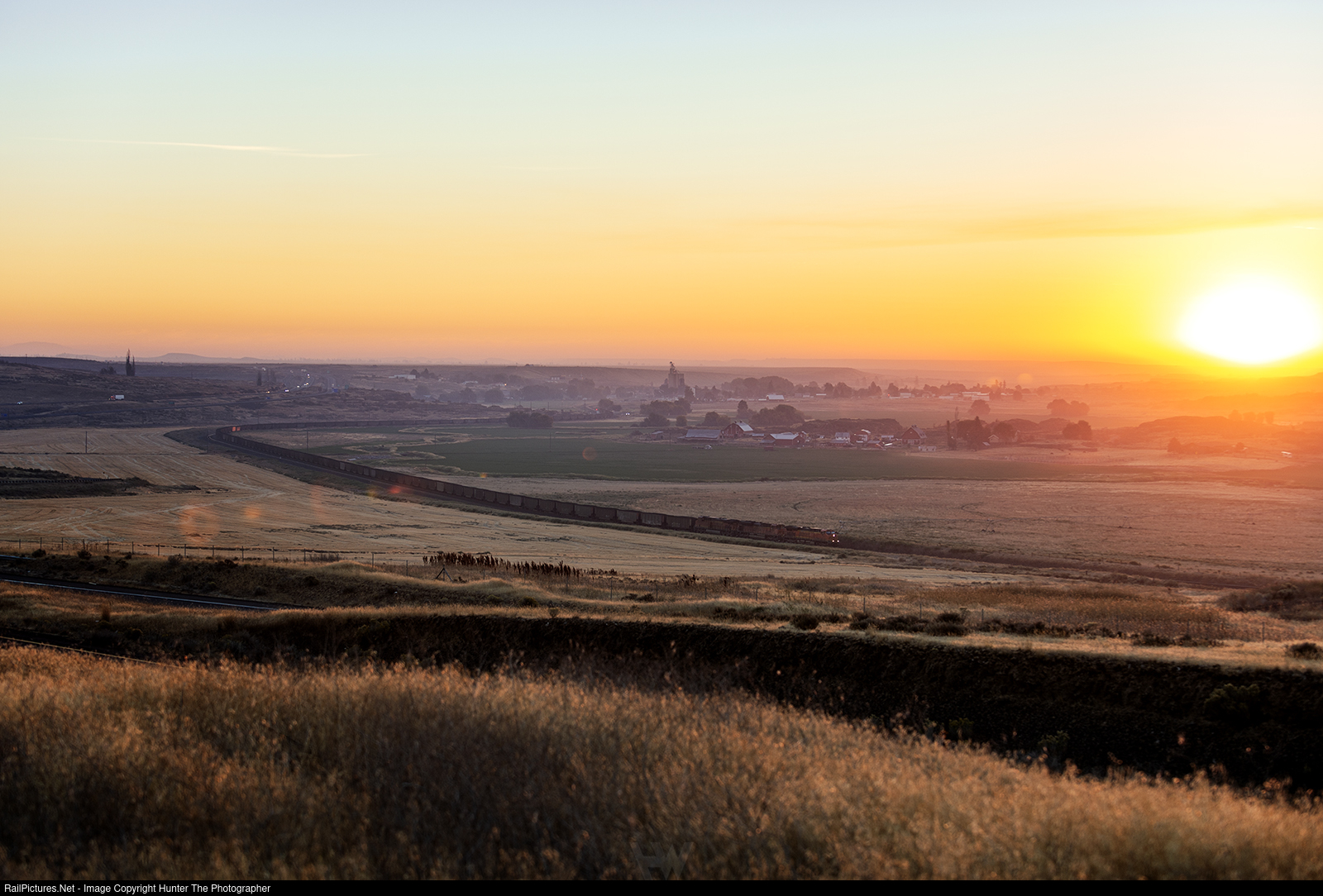 | Looking east towards the town of Sprague, WA, a westbound train of coal from Wyoming's Powder River Basin is seen making its way along the BNSF Lakeside Subdivision at sunrise on a cool Friday, September 26, 2025 morning.