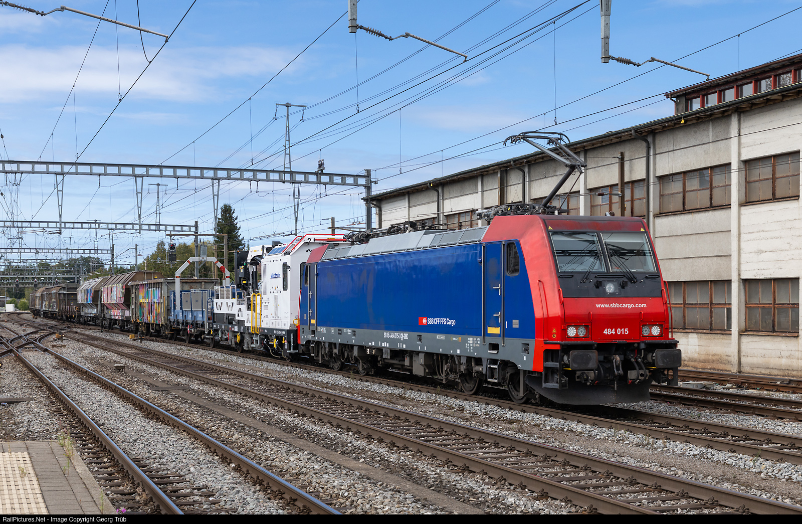 | Bombardier TRAXX F140 MS Re 484 # 015 of the SBB pulls the freight train 62259 from Bern Weyermannshaus freight yard via Olten-Brugg to the Limmattal shunting yard through Burgdorf. |