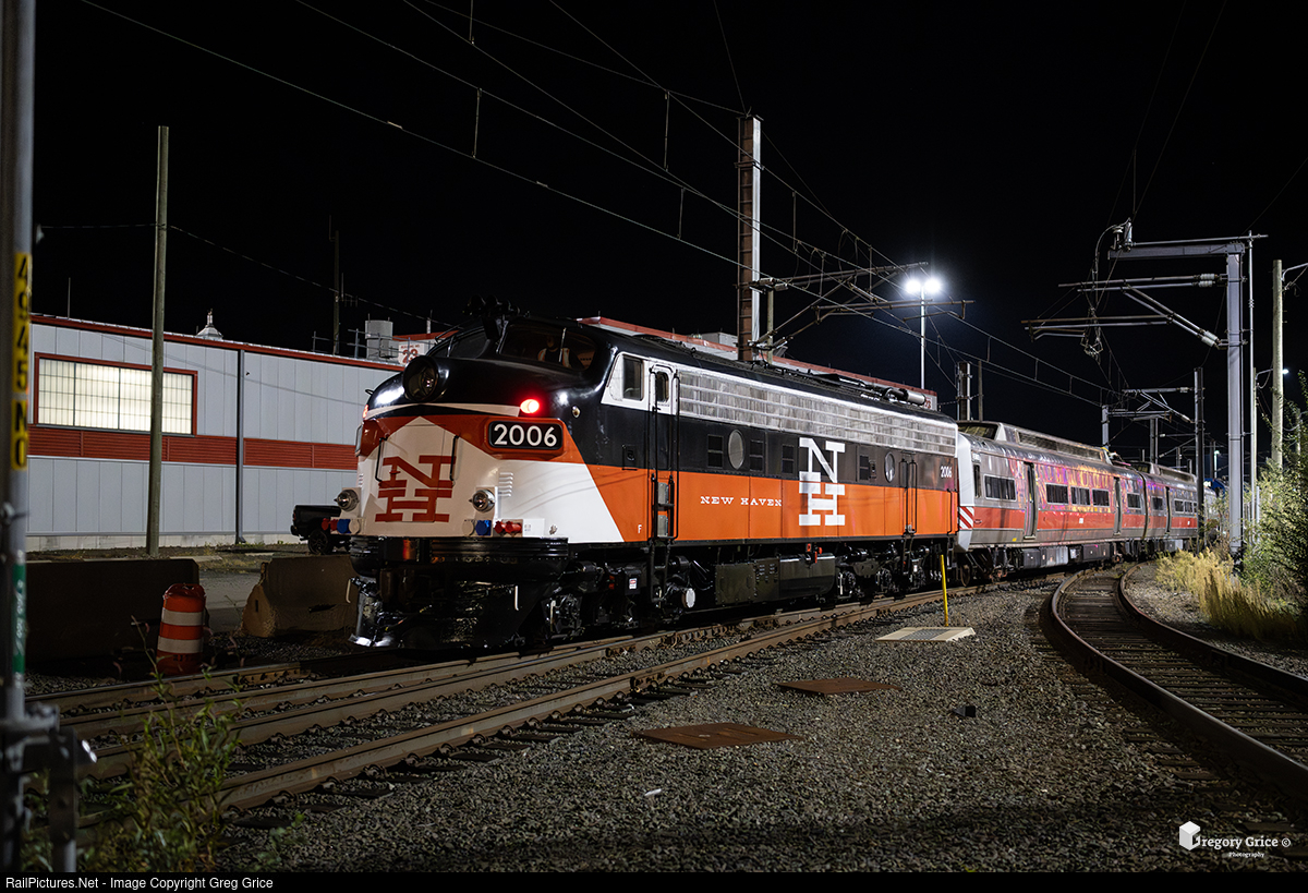 On the night of September 20th, 2025, Metro-North Railroad’s “New Haven Switcher” crew shuttled EMD FL9 CTDX #2006 and General Electric M2 pair MNCW #8707/8706 from the Danbury Railway Museum in Danbury, CT, to New Haven Yard via the Danbury Branch and the New Haven Line. The equipment was moved in preparation for display at the 2025 Metro-North Open House. In this photo, FL9 2006 leads the shove move past the Independent Wheel True (IWT) Facility on Track 41 in New Haven Yard.