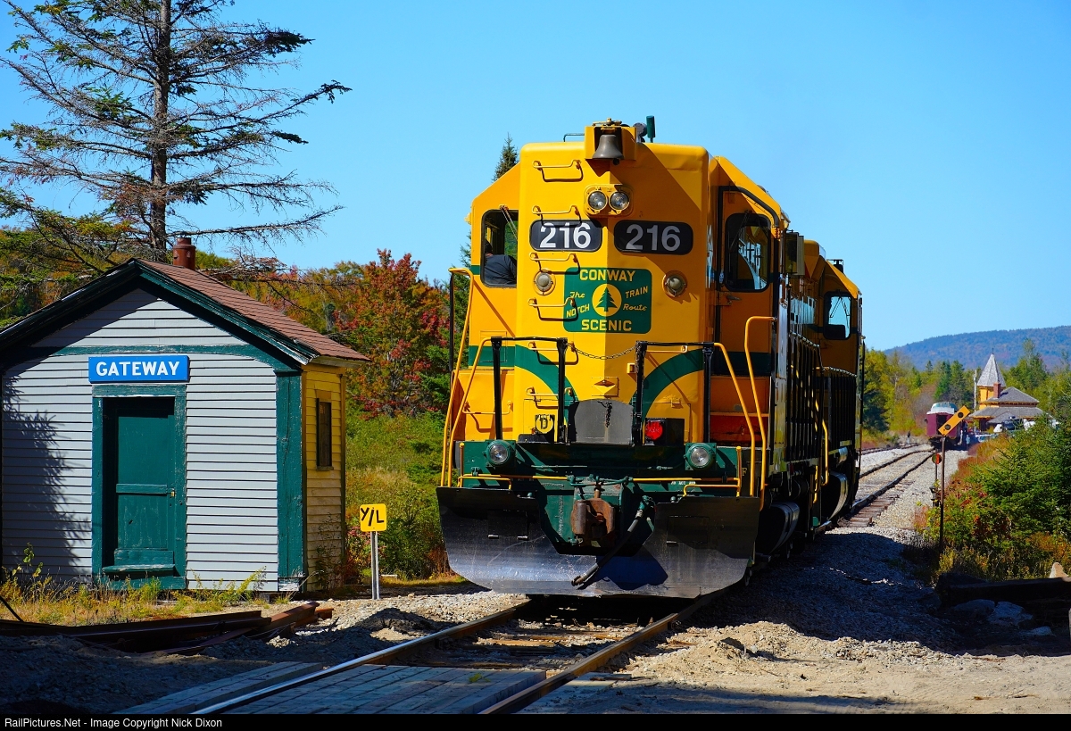 Conway Scenic's Maine Central-painted GP35 #216 and GP38 #252 have cut off from their train at Crawford Notch and are running around to the other end, pausing by the Gateway section house. They'll then lead the train back down the old MEC Mountain Division and back to North Conway.