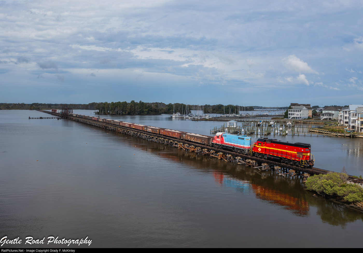 Carolina Coastal's #119 job crosses the long trestle over the Pamlico River at Washington, NC bound for the Belhaven branch at Pinetown.