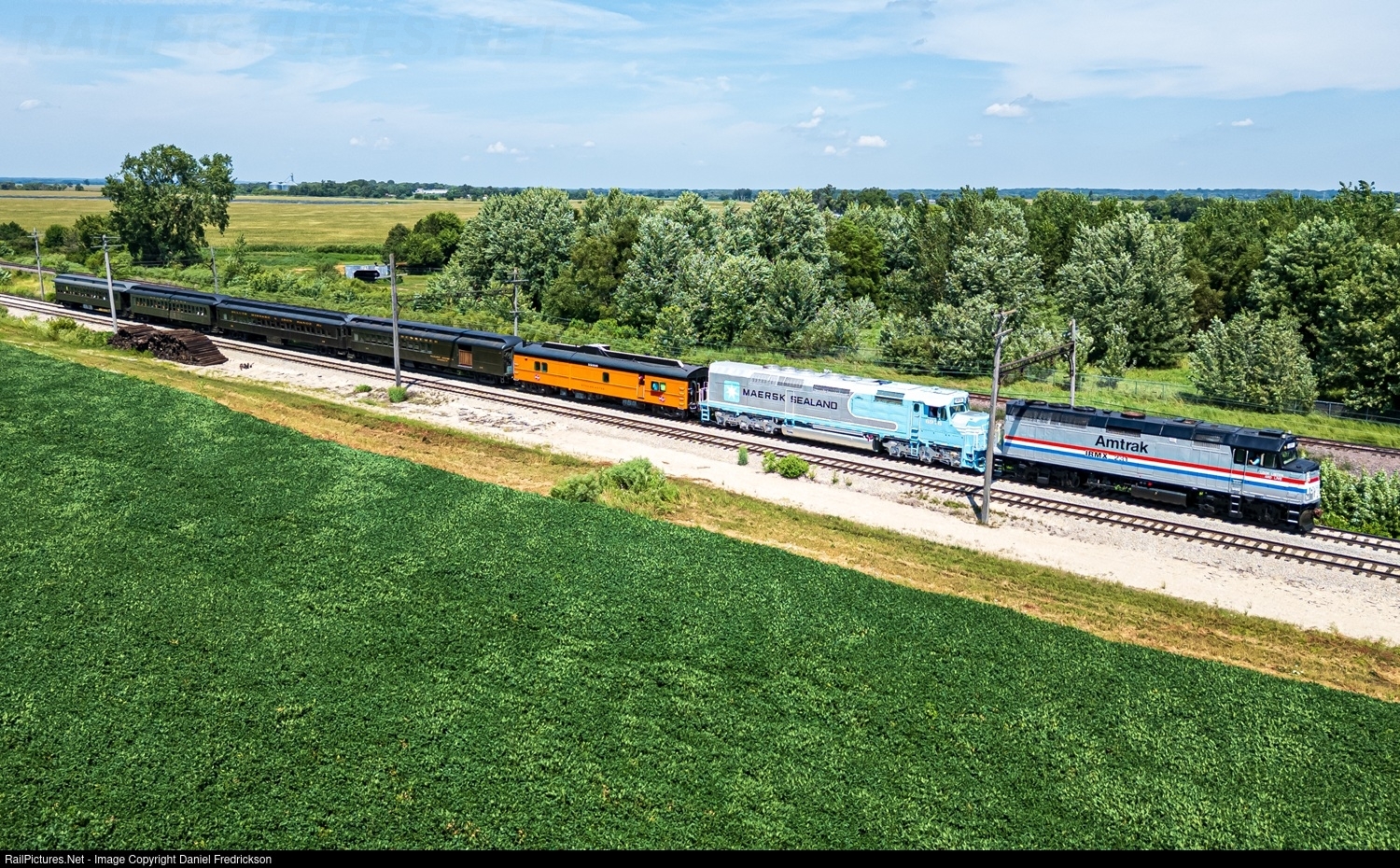 | During the Illinois Railway Museum's 2025 Diesel Days event, Amtrak 231 and BNSF 6976 - both new arrivals to the museum from the Nevada State Railroad Museum at Boulder City - pause in Johnson Siding with the coach train, waiting to continue westbound. |