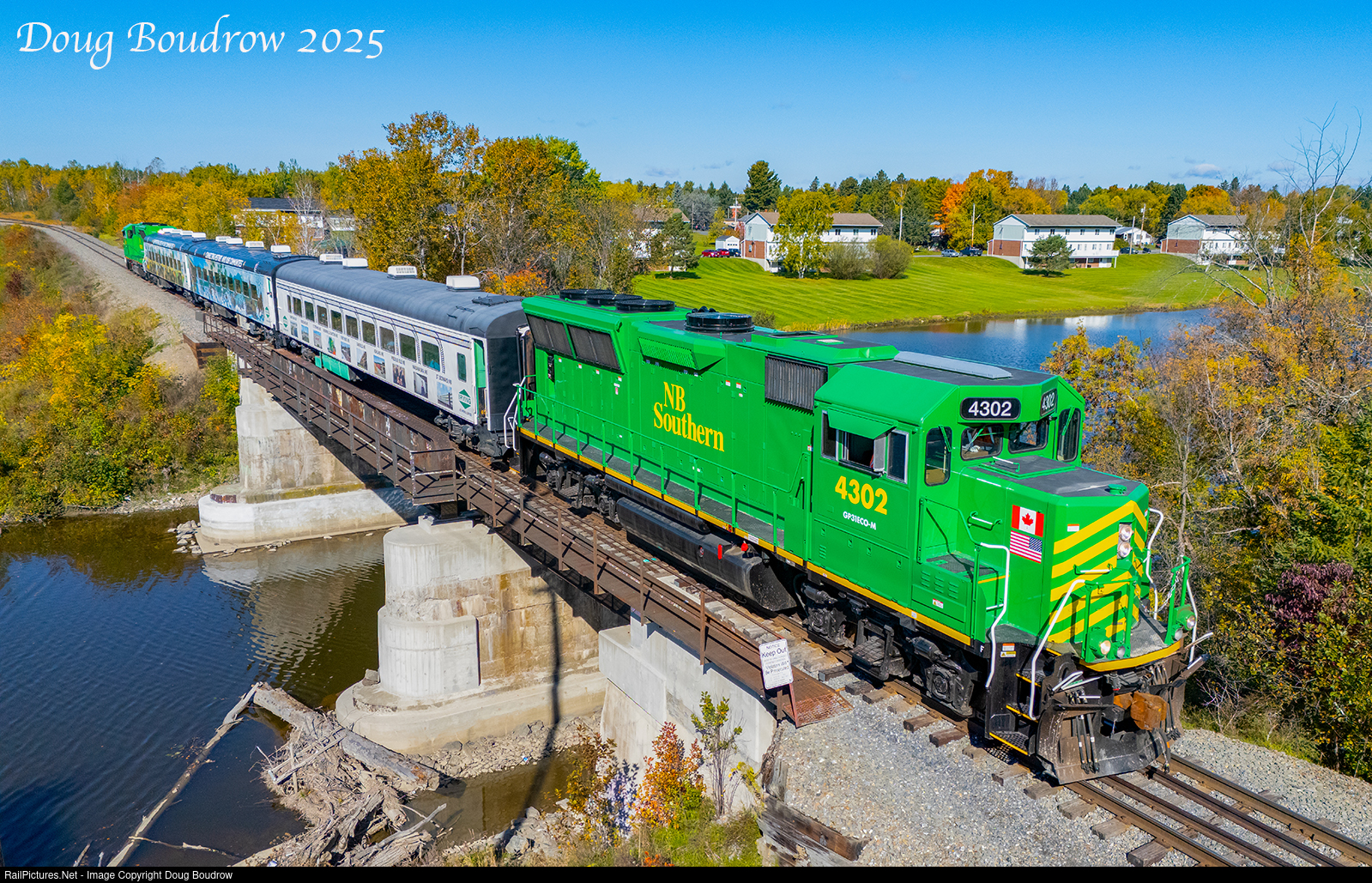 | On September 27th, Maine Northern Railway ran two passenger extras West out of Presque Isle. The first train was available to to the public to purchase tickers, the second train was for employees and their families. The public train is seen heading East back into town crossing Presque Isle Stream on former Bangor & Aroostook trackage. |