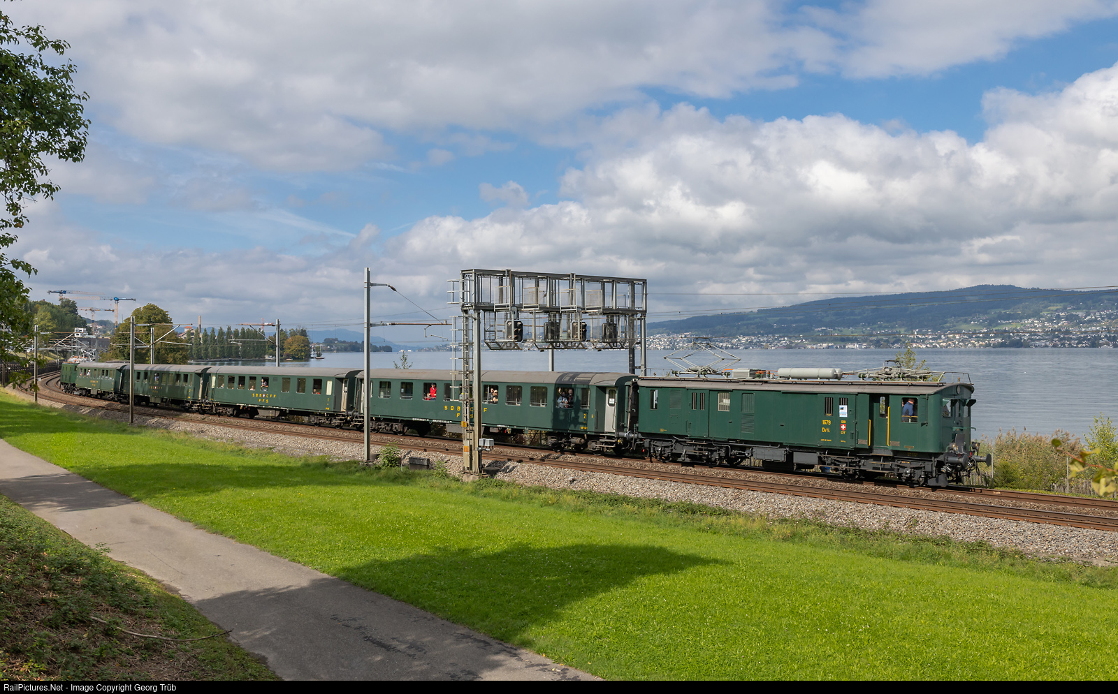 | Various special trains ran to celebrate 150 years of the Zurich Lake Railway left bank (Zurich-Thalwil-Pfäffikon SZ-Ziegelbrücke). The baggage railcar De 4/4 # 1679 (SBB Historic Winterthur) pulls train 31267 from Wädenswil to Pfäffikon SZ along the shore of Lake Zürich, between Wädenswil and Richterswil. In the rear is Ae 3/5 # 10217 of SBB Historic Olten. The former SBB cars are owned by association steam depot Full (DDF). |