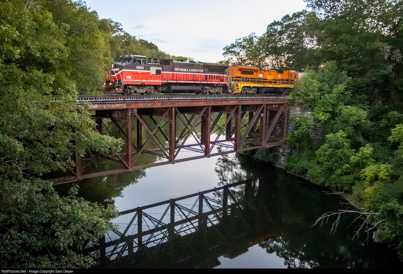 Providence and Worcester WODA (Worcester, MA to Davisville, RI) makes its way over the Blackstone River. Though it's usually an overnight train, track work on the Northeast Corridor had them running earlier in the evening in the summer of 2025. In late August, 4005, one of the surviving road units in P&W corporate colors, was assigned to the train.