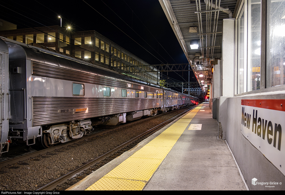 Just after midnight on September 22, 2025, Amtrak train 847, towing the BNSF Ryder Cup OCS special, paused for a crew change at New Haven Union Station on the New Haven Line in Connecticut. The train was forced to detour from its original routing, traveling from CSX’s Selkirk Yard to Long Island via the Boston & Albany, Springfield Line, New Haven Line, Hell Gate Line, and Fremont Secondary. This unusual move was necessary due to lingering clearance concerns with Metro-North Railroad’s underrunning third rail, despite modifications made to much of the 14-car consist. This photo shows BNSF 69, the "Eagle Pass", with generator removed to meet third rail clearances. 69 was built in 1950 by the American Car & Foundry Company (AC&F, Lot #3358, Plan #9011) and served ATSF, Amtrak, KCS and a Private Owner before becoming a 6-bedroom crew dorm for BNSF.