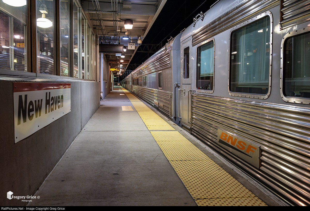 Just after midnight on September 22, 2025, Amtrak train 847, towing the BNSF Ryder Cup OCS special, paused for a crew change at New Haven Union Station on the New Haven Line in Connecticut. The train was forced to detour from its original routing, traveling from CSX’s Selkirk Yard to Long Island via the Boston & Albany, Springfield Line, New Haven Line, Hell Gate Line, and Fremont Secondary. This unusual move was necessary due to lingering clearance concerns with Metro-North Railroad’s underrunning third rail, despite modifications made to much of the 14-car consist. This photo shows BNSF 69, the "Eagle Pass", at the platform on Track 1. 69 was built in 1950 by the American Car & Foundry Company (AC&F, Lot #3358, Plan #9011) and served ATSF, Amtrak, KCS and a Private Owner before becoming a 6-bedroom crew dorm for BNSF.
