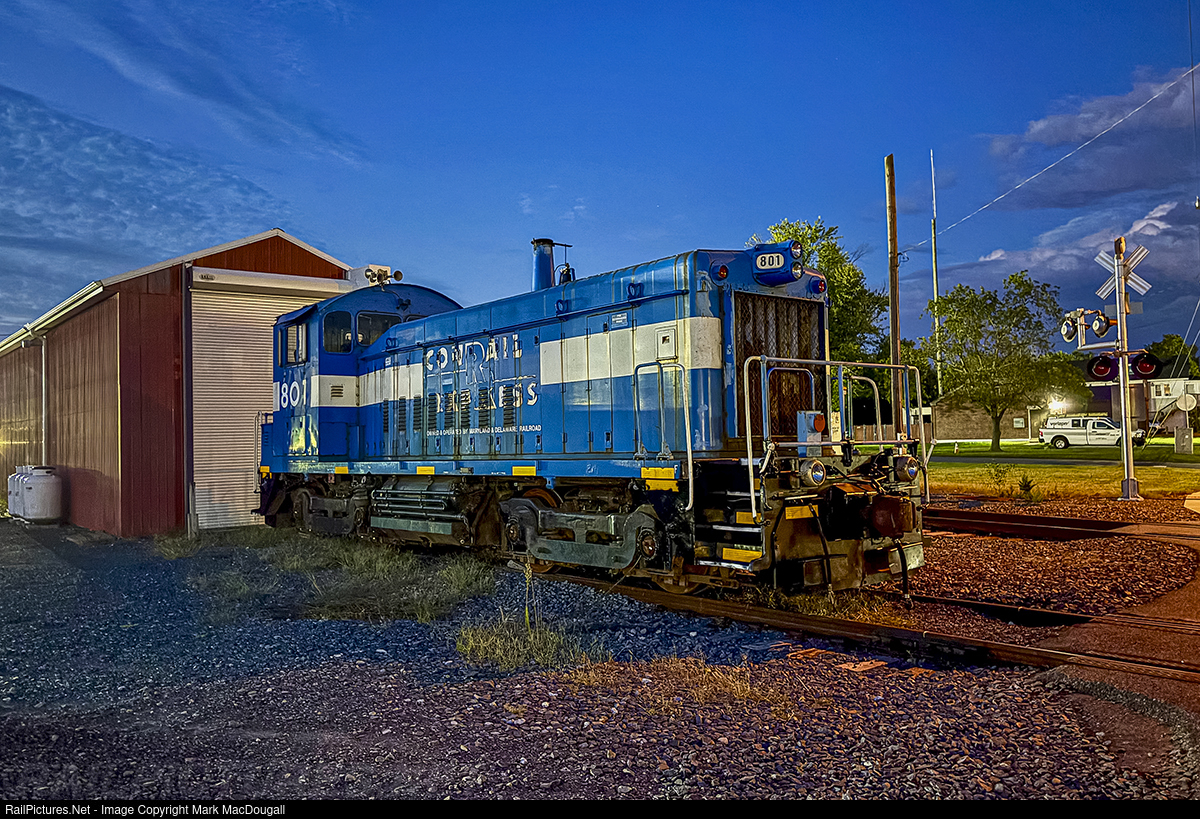 Maryland & Delaware's Conrail Express painted SW900 sits at Selbyville, faced with an uncertain future. The MDDE's ops were taken over by Carload Express, owners of neighboring road Delmarva Central. The MDDE's longtime mainstay RS3Ms have been sold to the Delaware-Lackawanna, while this unit remains. MDDE 801, an ex-NYC unit, was one of two engines painted for Conrail Express, a short-lived shortline program that CR operated. The other unit, an RBMN U23B, was wrecked not long after being released in the early 90s.