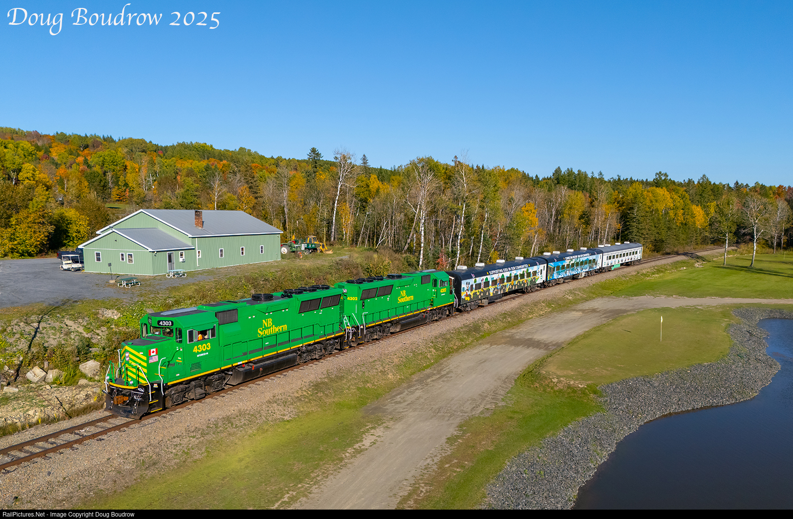 | After two passenger excursions out of Presque Isle, the New Brunswick Southern passenger set is deadheading for Millinocket. Two of the railroad’s fresh GP31ECO-M units are leading the train as they pass Trackside Golf in Mapleton. |