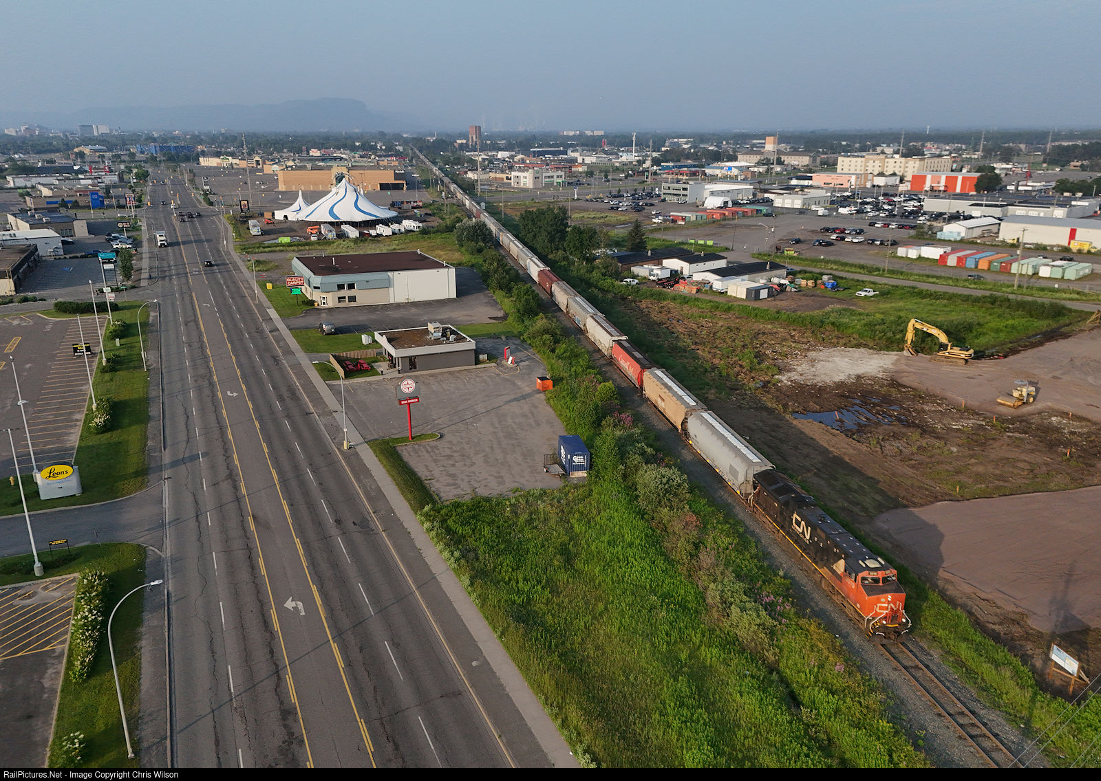 Train G890 with grain for Richardson heads through the intercity shopping district in Thunder Bay on its way to CN's Port Arthur Yard. CN's mainline to Western Canada from Lake Superior cuts across Thunder Bay while CPKC's route follows the shoreline. In 2005 CN ended service (rails removed a few years following) east of Thunder Bay across the 190 mile Kinghorn Sub connecting to CN's transcontinental mainline at Longlac.
